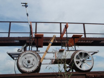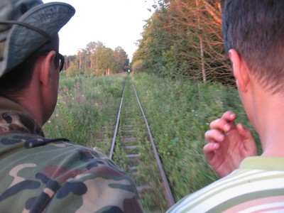 Оно и понятно, дрезина ехала по дороге, Артем бежал по бездорожью. Я, Слава и Люба идем сзади и думаем, что примерно через километр заросли закончатся, дрезина вылетит на эстакаду и на полном ходу гробанется вниз. Мысли плавно перетекают из ностальгических а-ля "Какая хорошая была тубареточка, хоть и бешеная" до садистко-жестоких "Даю 100 баксов, лишь бы заснять, как она будет падать вниз". Однако через какое-то время мы слышим, что звук двигателя из колеблющегося стал равномерным и даже более того, звук не удаляется. Хм, это уже интересно. Пройдя еще 500 метров, мы увидели дрезину стоящей на насыпи, задними колесами соскочившую с рельсов.