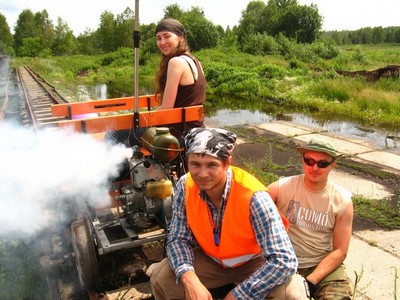 Идея поездки по узкоколейке, тянущейся от пос. Колодино до самого Руденска родилась совершенно спонтанно, как и почти все идеи нашего секретного туристско-спортивного общества "Шиза". На самом деле, я собирался втихаря пройтись там пешком. Однако среди знакомых мне спелеологов оказался Артем, до фанатизма увлеченный узкоколейками, и даже имеющий дрезину, которую спроектировал и собрал сам, на коленке. Общий язык нашли в течение 1 минуты, по истечении которой Артем пообещал прокатить меня и Любовь Сергеевну по узкоколейке. Бутылочным горлышком в реализации этой идеи было отсутствие у кого-либо из нашей троицы машины, на которой надо было завезти дрезину в разобранном виде до места. Мое предложение поднатужиться и доставить аппарат к узкоколейке на электричке через Руденск Артем отмел на корню, так как общий вес дрезины с двигателем составлял около 80-90 кг. Да еще и с рюкзаками на плечах. Однако на хорошую идею людей найти проблем не составляет, и уже через неделю на нашу авантюру подписался Слава, друг Глаза, с которым они вместе ездили на «батоне» в Магадан. В конечном итоге, окончательная дата старта была назначена на 9 июля 2011 года. Забегая немного вперед скажу сразу, что поездка получилась настолько эпической, что, пожалуй, жестокая и беспредельная Гайнаниада 2010 с болотингом, переправой через Гайну и прорубанием в темноте при свете налобников к деревенской грунтовке теперь мне кажется невинной детской шалостью.