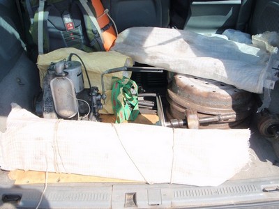 Часам к десяти утра, в субботу 9 июля мы уже забирали из дома Артема с дрезиной. Говоря по правде, я ожидал увидеть нечто большее, чем пару матерчатых мешков с железяками и болтами, 4 обода и небольшой одноцилиндровый двухтактный движок, снятый с какой-то совковой лесопилки.