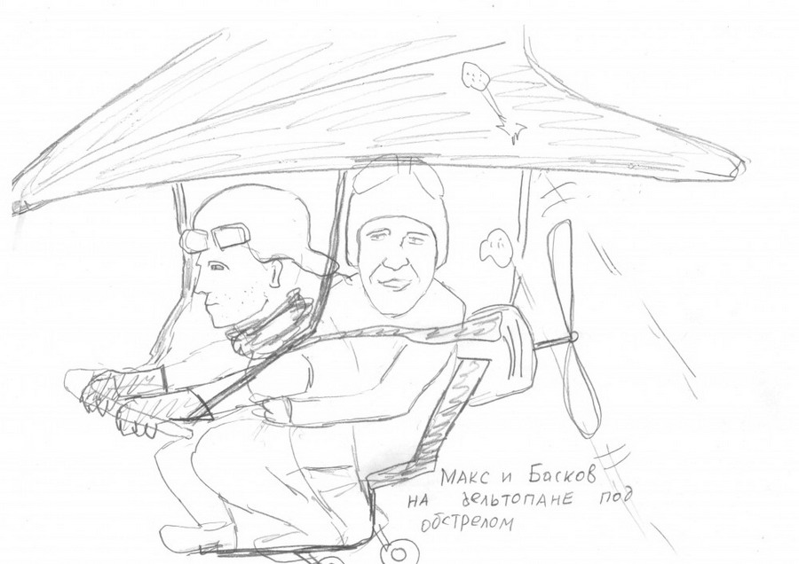 Это Максим-Лётчик помогал всем желающим в рекогносцировке будущего стрельбища. Дельтаплан с Летчиком и экскурсируемым пассажиром Басковым сочли подходящей мишенью для учебных стрельб. В небо полетели заряды. Даже были какие-то попадания, благо без повреждений.