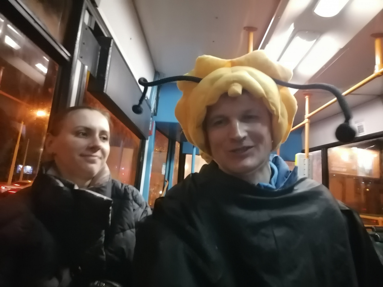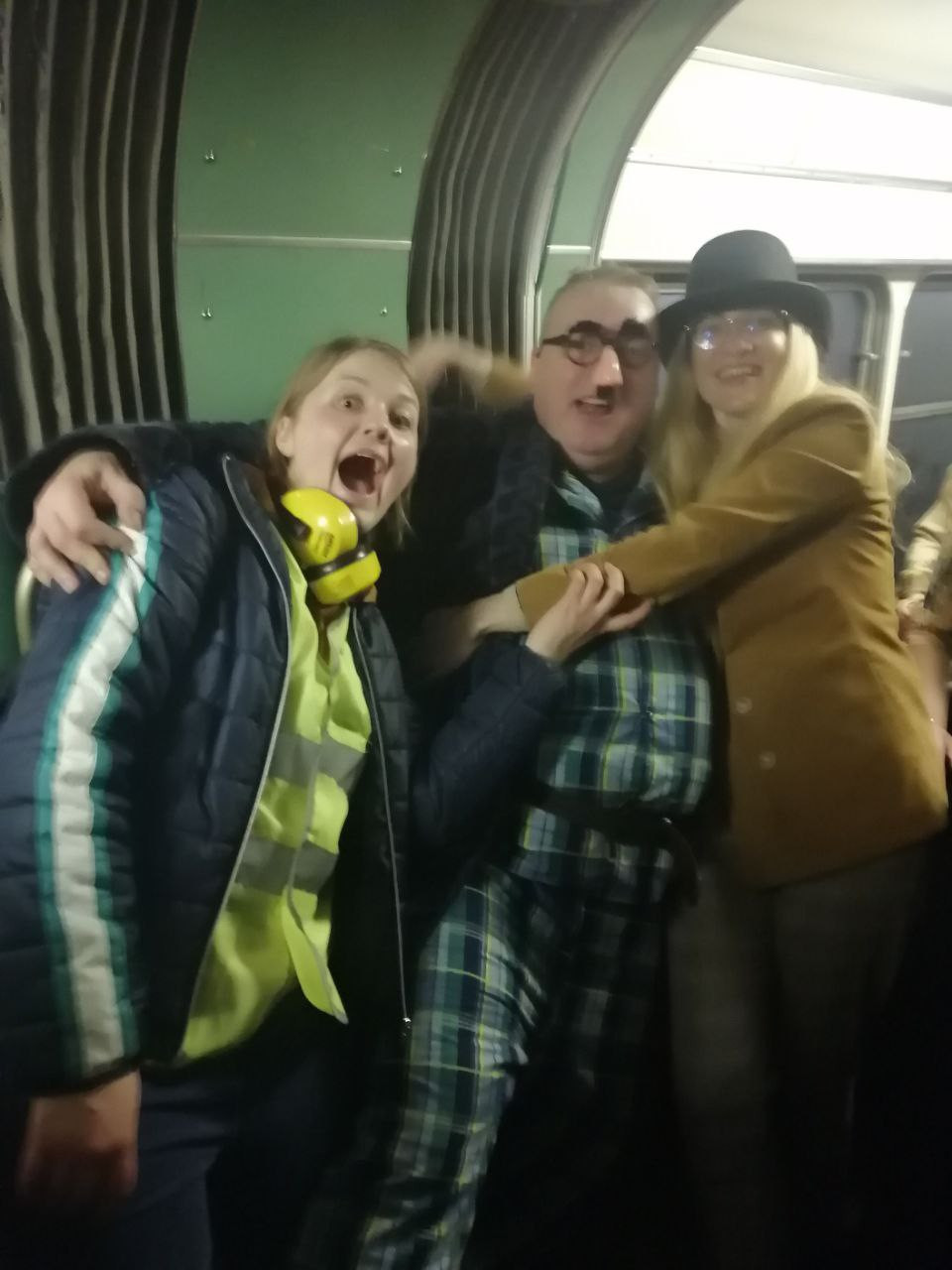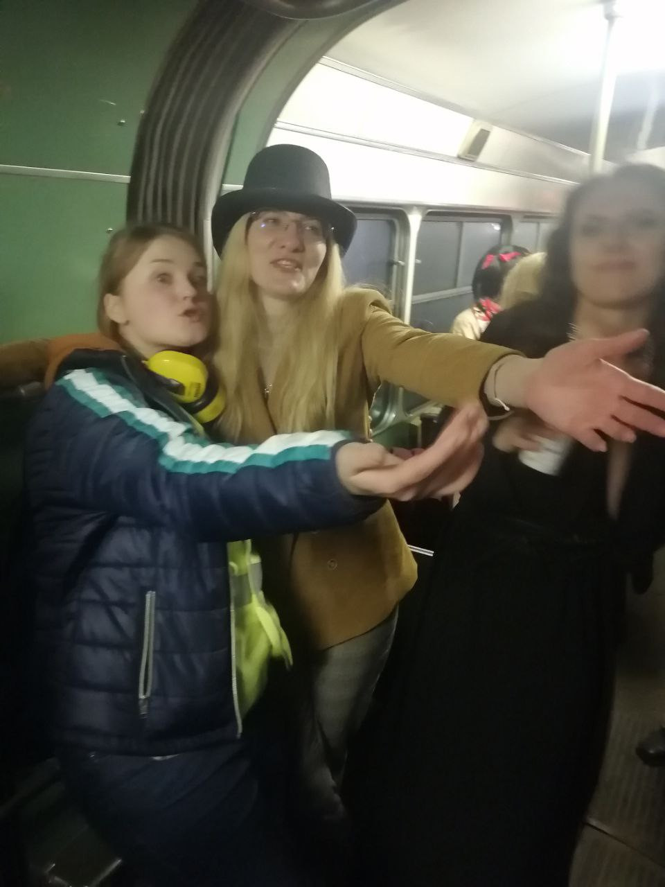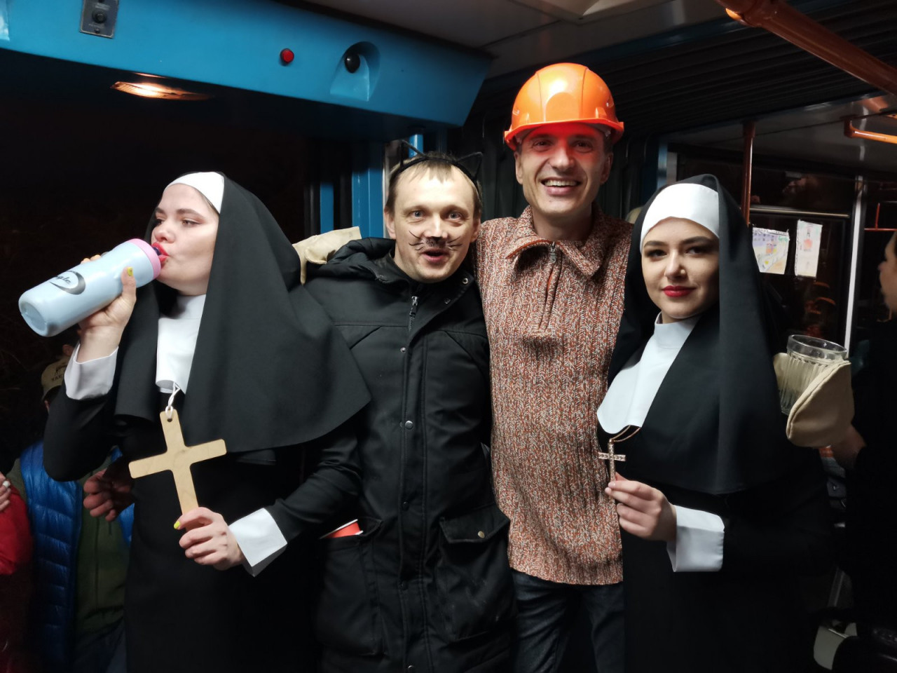 Из депо вытащили ретро трамвай GT-8D (https://ru.wikipedia.org/wiki/GT8). Его уже давно не выпускают на линию. Освещенный старинными плафонами, обтекаемый и фундаментальный пришелся он для нас как нельзя лучше. В нем мы провели час. Пестрая костюмированная публика вела себя высокопарно. А снаружи шел дождь. Это только добавляло уюта и душевной атмосферы при тусклом свете старинных плафонов внутри.