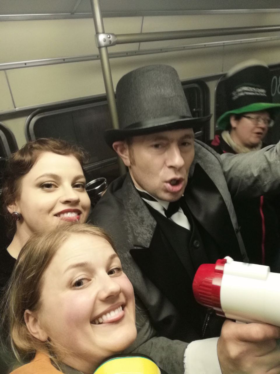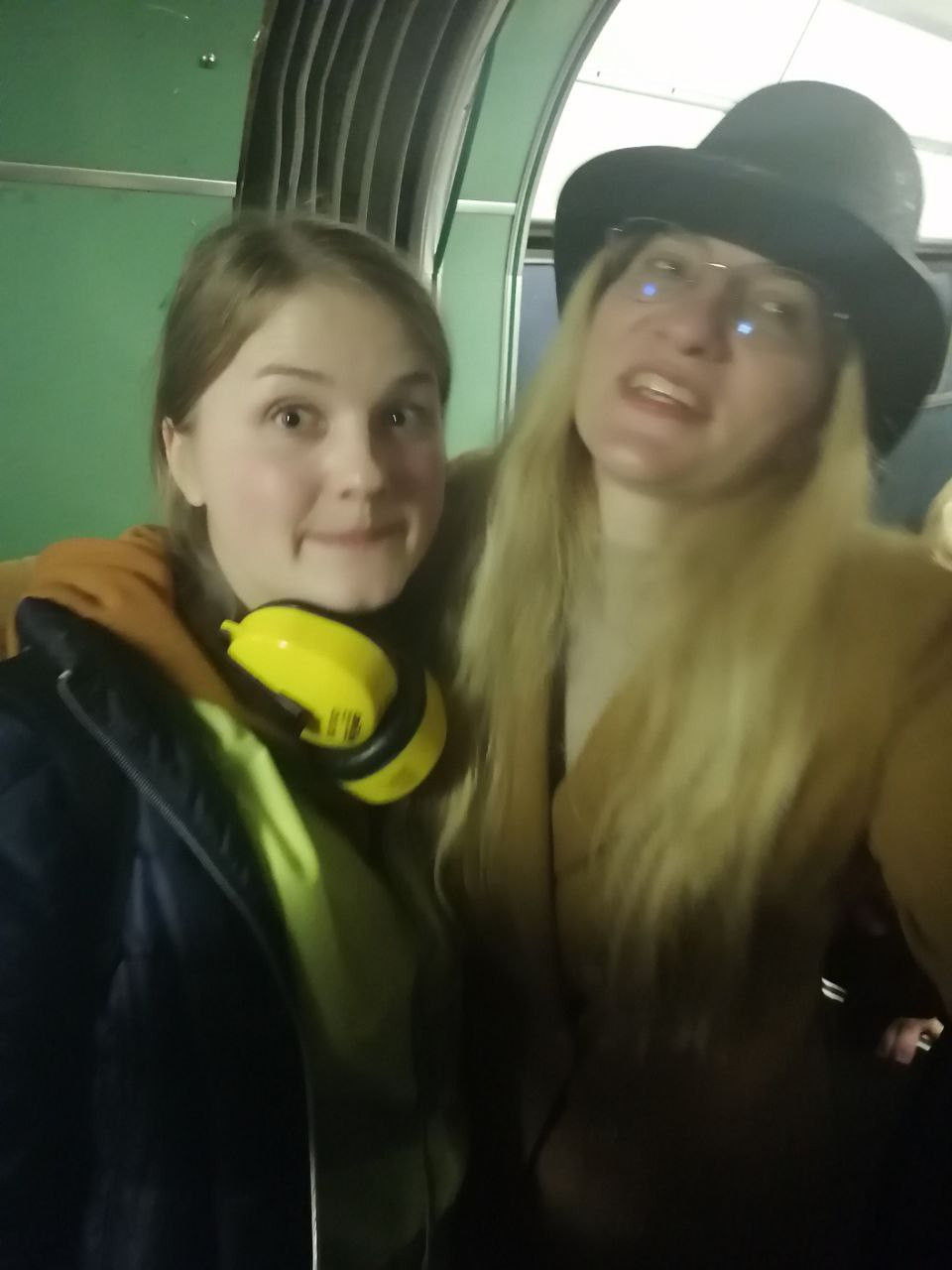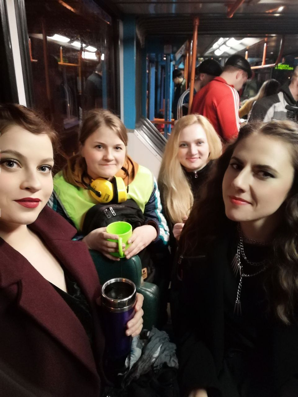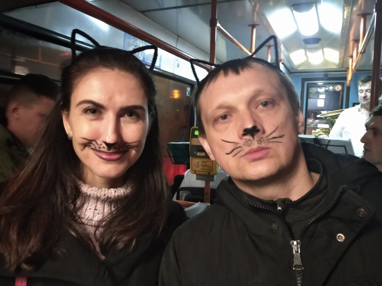 Из депо вытащили ретро трамвай GT-8D (https://ru.wikipedia.org/wiki/GT8). Его уже давно не выпускают на линию. Освещенный старинными плафонами, обтекаемый и фундаментальный пришелся он для нас как нельзя лучше. В нем мы провели час. Пестрая костюмированная публика вела себя высокопарно. А снаружи шел дождь. Это только добавляло уюта и душевной атмосферы при тусклом свете старинных плафонов внутри.