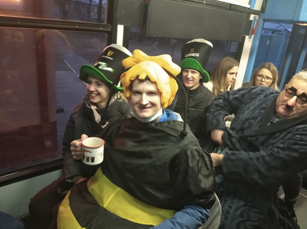 Контраст удался. Пришли прекрасные женщины в изящных вечерних платьях. Кого там только не было. Наряду со всеми появились вдруг чопорно чванливая диаспора ирландцев. И что может быть нелепей собрать в одном салоне (вагоне) до кучи инопланетян с антеннами и анимационные персонажи, - чебурашки, мишки, пчелки!