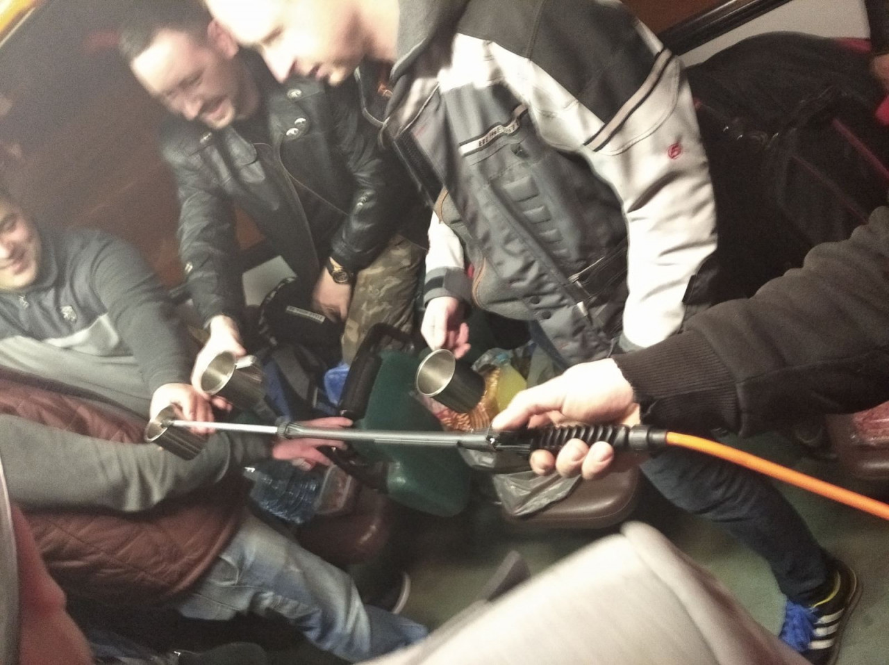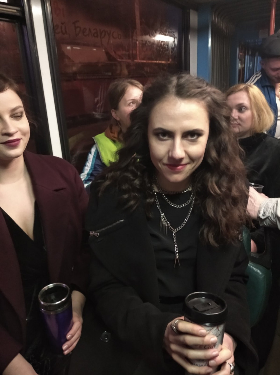 Многочисленные остановки по пути в Серебрянку. Но двери закрыты. Чем дальше мы ехали к Серебрянке, тем более потели окна. Пассажирам (человек 80) не сиделось. Стояли, ходили, держались за поручни. Долгий салон с двумя гармошками, казалось, двигается, как на шарнирах. Градус повышался, вместе с тем уровень всеобщего настроя пропорционально тоже. Играл без перерыва оркестр.