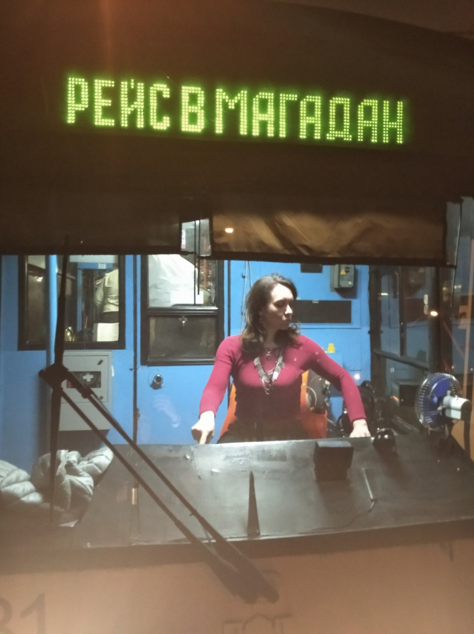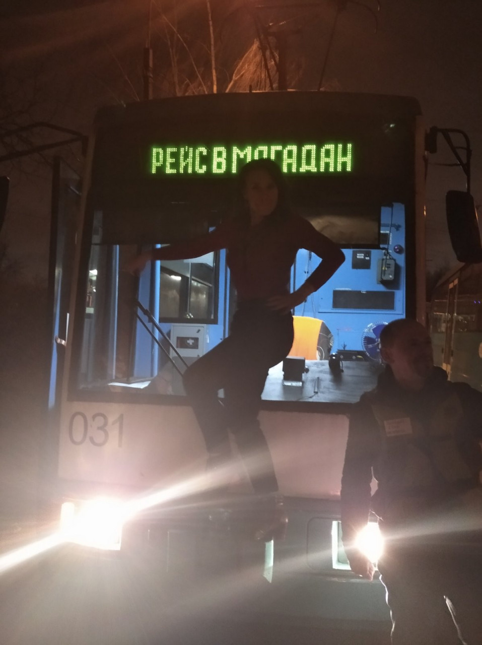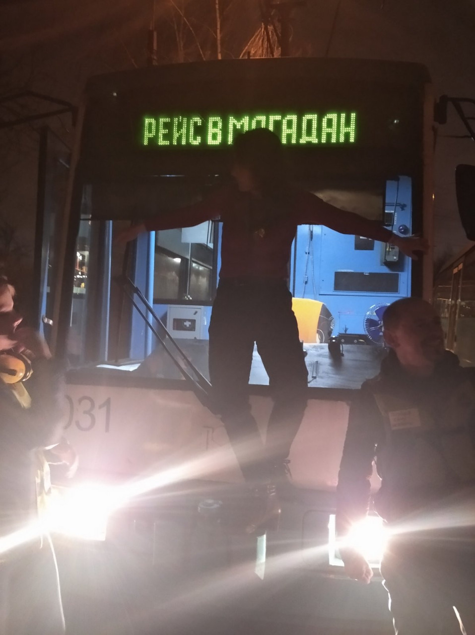 Но прошел час. С помощью мегафона аудиторию снова усадили в АКСМ 743. Водитель терпеливо ожидал и даже позволял фотографироваться в кабине. Рейс В Магадан, согласно договору и полностью выполняя предписанный график, съездил на кольцо Мясникова, и далее пошел себе в Зеленый Луг.