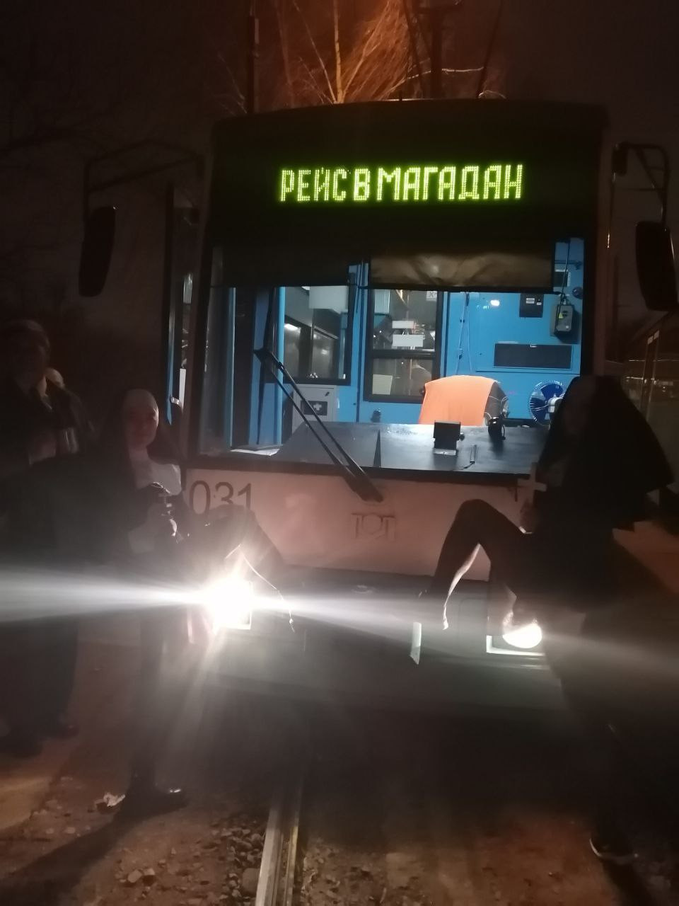 Из-за поворота вдруг с бесшумной торжественностью появился с зажженными фарами 31-ый трамвай. Он был настолько длинный и не обычный, что пассажиров охватило всеобщее возбуждение. Вместо маршрутного номера на табло крупно светилось «Рейс В Магадан». Он не казался таким уж разъебанным, а напротив, выглядел особенно значительно.