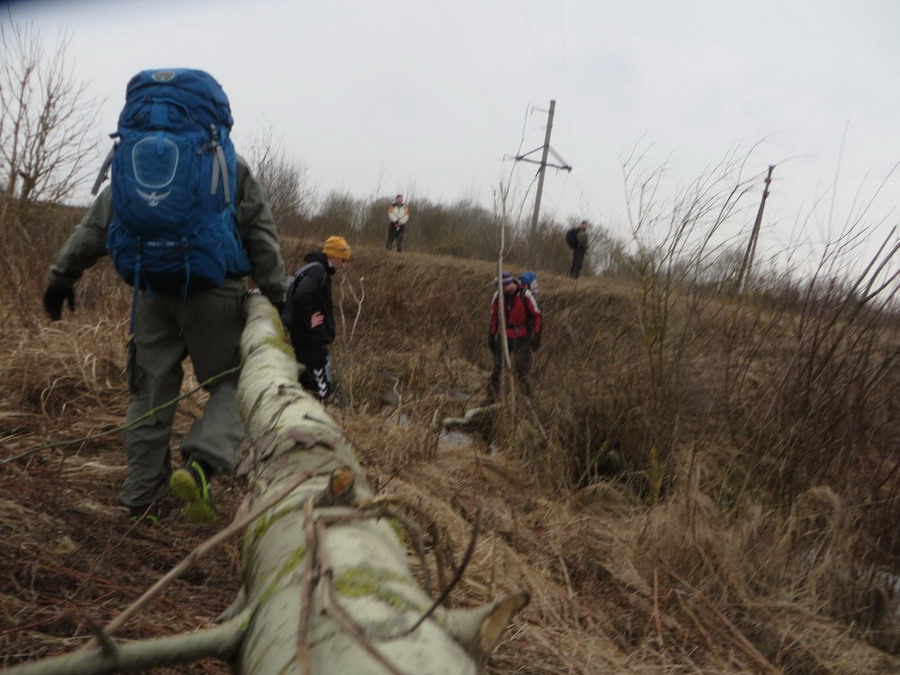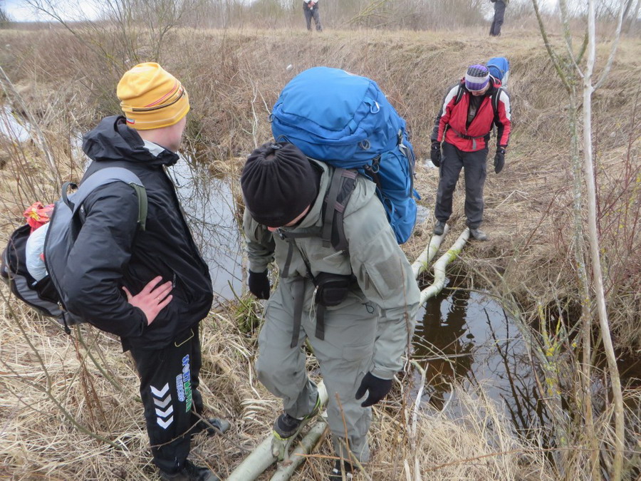 А еще чуть позднее встретилась нам мелиоративная канава, которую пришлось форсировать. При этом Глаз не стал дожидаться пока мы построим переправу из перегрызенных бобрами деревьев и решил её перепрыгнуть. Нога до берега допрыгнула, однако, край обвалился. Несчастный Глаз замок по колено одной ногой в воду.