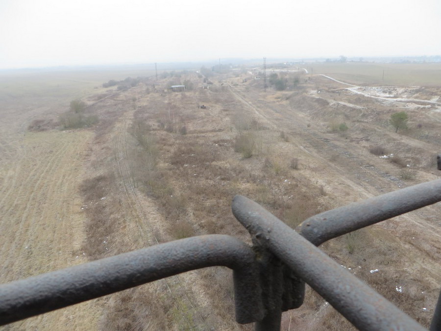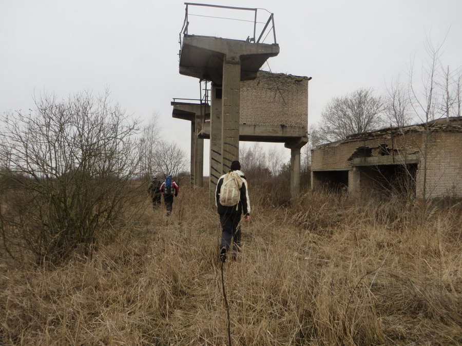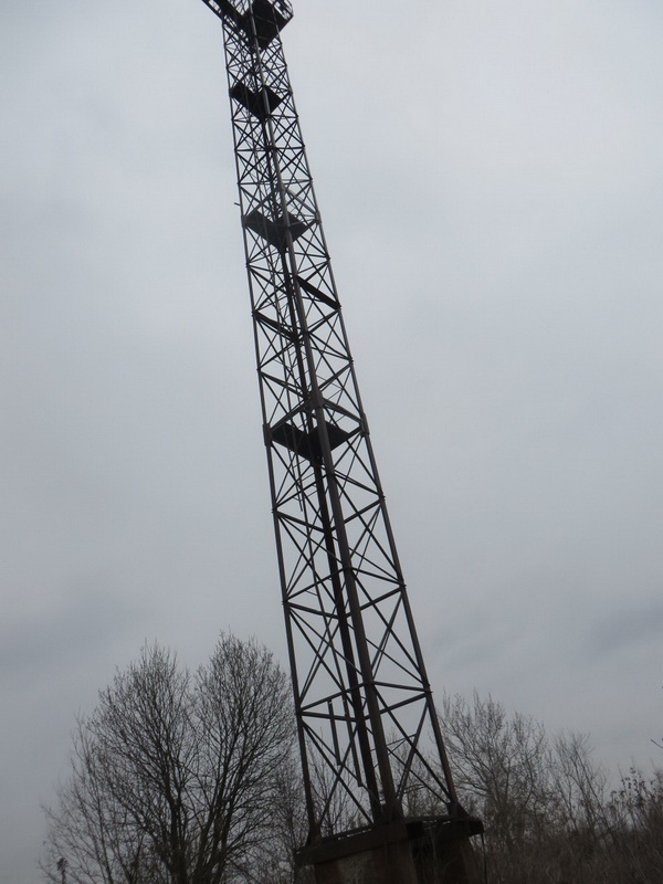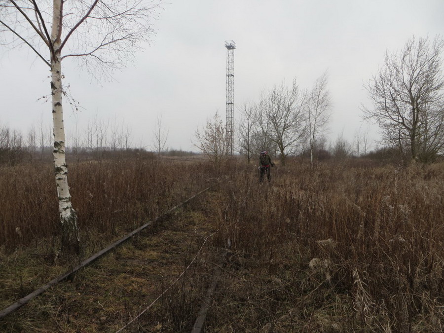Уже вскоре нам повстречались заброшенные промышленные сооружения бывшей торфоперегрузочной станции, рядом с которыми находилась такая же забытая трудовым людом вышка. Это был совершенно стандартный железнодорожный осветитель со снятым оборудованием. В визуальной близости таких было еще три или четыре. Для тренировок туристов-альпинистов объект очень подходящий.