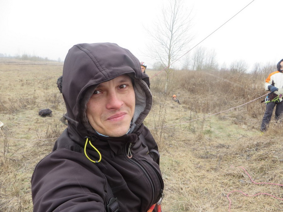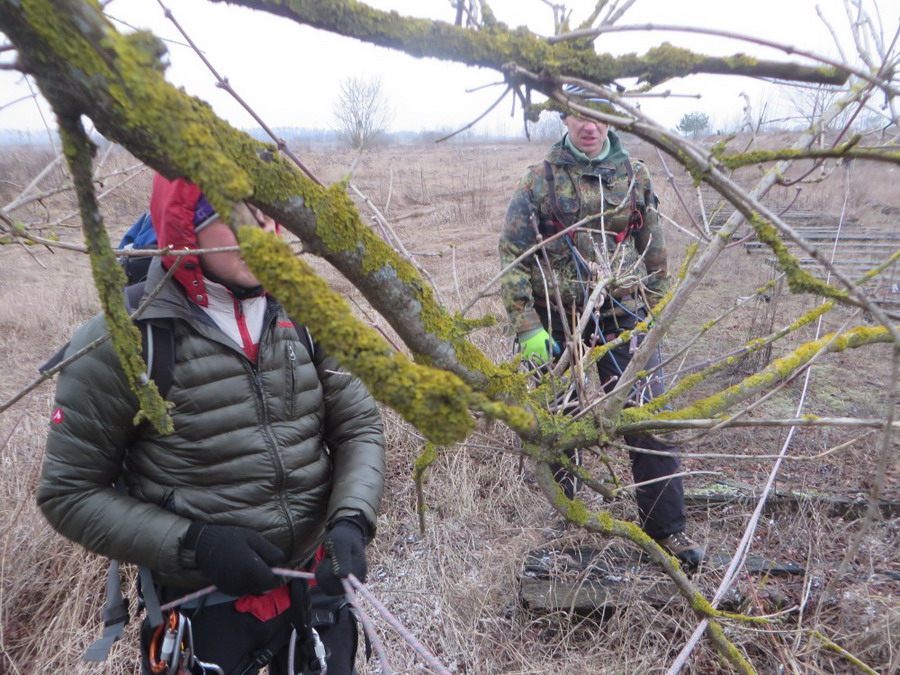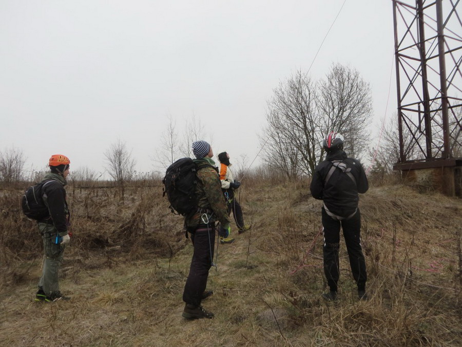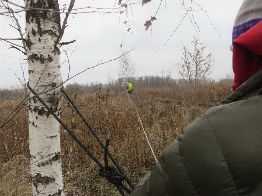 После вышки мы расслабились и начали снимать обвязки, как Глаз придумал нам новую развлекуху. Мы поделились на две тройки. Требовалось идти этими тройками ажно до железной дороги. Но представить, что это не плоскость, а сложный рельеф. В качестве точек страховки и промежуточных точек опоры можно было использовать деревья, кусты, антропогенные предметы, но не чистое поле.
