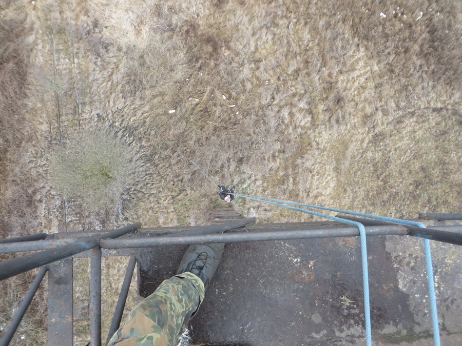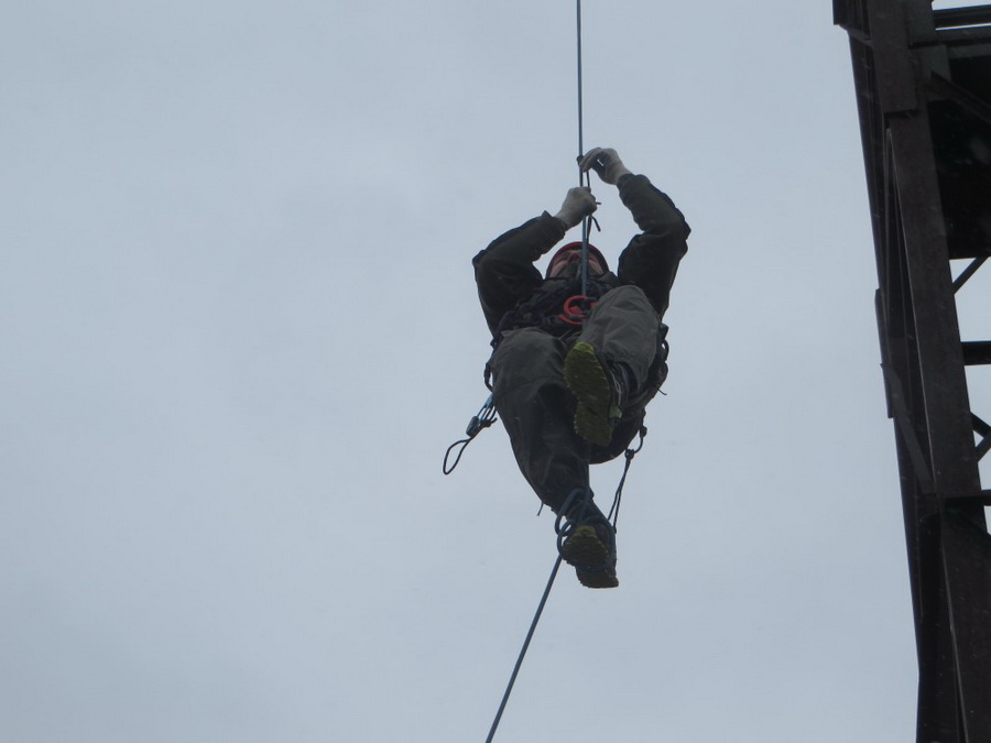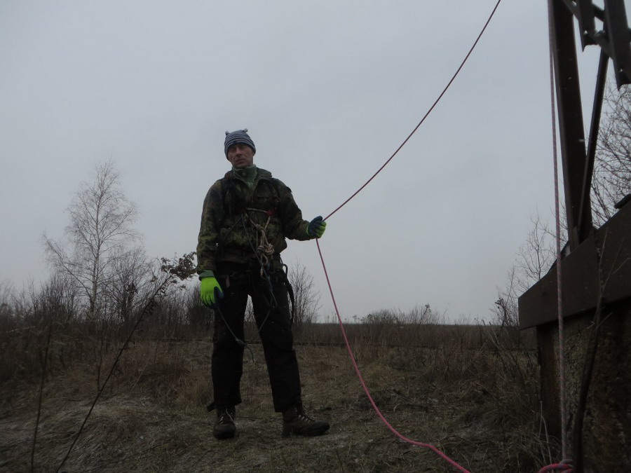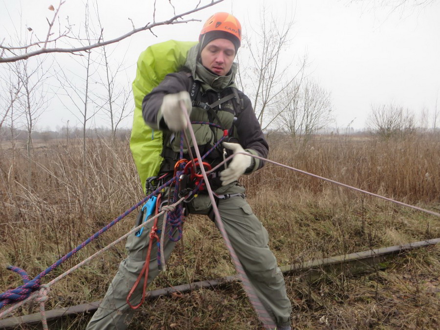 И отработал, как я думаю, для новичка неплохо. В общей сложности с разными методами страховки я спустился три раза. После тренировки индивидуальных спусков группа пару раз отработала спуск «пострадавшего». Пассивно подвешивали пушечное мясо и сдавали уже сверху.