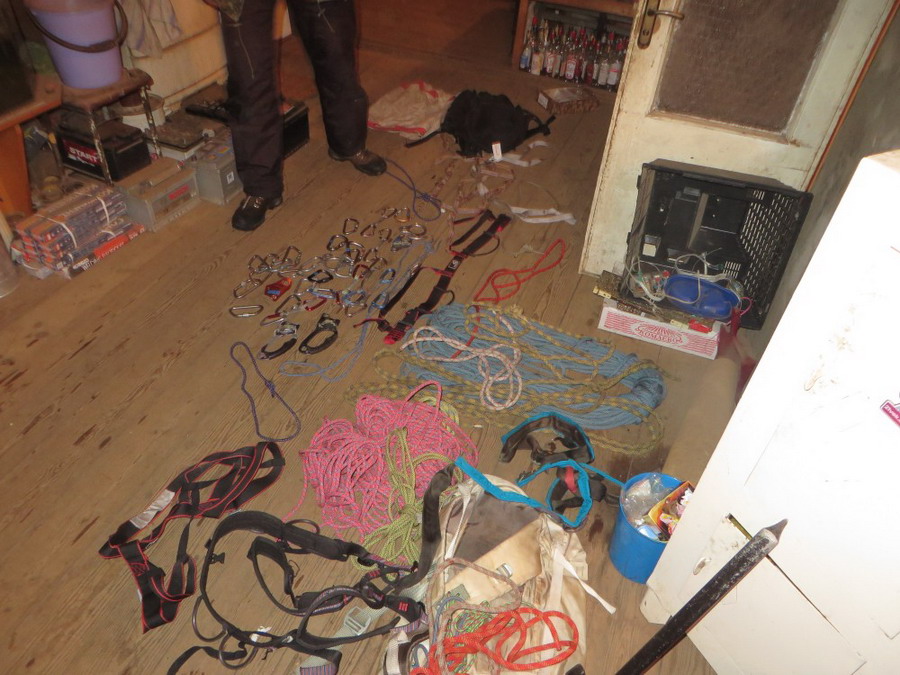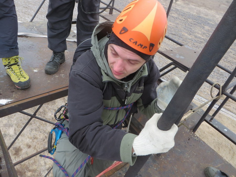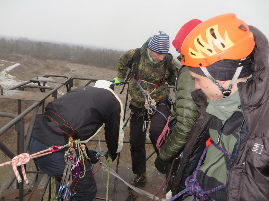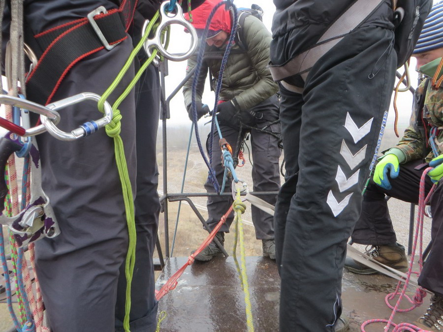 Но заниматься снаряжением лучше именно на собачьем холоде и ветру. После начали отрабатывать спуск по закрепленной сверху верёвке типа дюльфер. Малоопытных первый раз подстраховывали, выдавая (протравливая через тормозное устройство) сверху другую веревку.