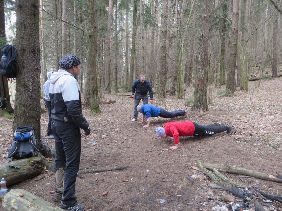 По окончании трассы команда атлетов углубилась в близлежащий лесок для проведения следующего этапа тренировочных мероприятий. Доктором тут же были назначены процедуры в виде 100 отжиманий и 30 приседаний на каждую ногу. С нытьем, тяжкими вздохами и хрустом в суставах, сопровождаемыми ободряющими возгласами главврача, эта часть испытаний была так же успешно преодолена.