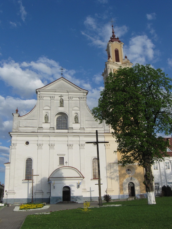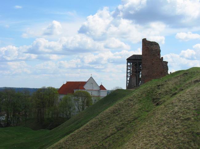 Около часа мы посвятили этим могучим сооружениям. Затем, поднявшись на неподалеку расположенный, еще более высокий холмик, именуемый горой А Мицкевича, спустились к подножью холма, где в свою очередь располагается замечательный во всех смыслах фарный костел Преображения Господнего. В этом костеле 600 лет назад женился известный литовский князь Ягайло. Погуляв немного вокруг, неспешно отправились на трассу. Следующий пункт Мир!