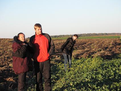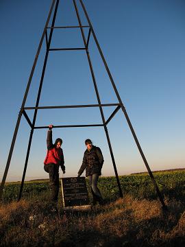 Добраться до туда не сложно. От развилки в деревне Цитва идет гравийная дорога. Но непосредственно к «пупу земли» она не подходит. На его место указывает пирамида трегопункта. С полкилометра мы шли по сиротливому ветреному полю по какой то культуре с мелкими желтыми цветочками, что-то типа дикой редьки. Пустырь пустырем. Ближайший лес далеко, также далеко, но с другой стороны лиственная лесопосадка железной дороги, уже поближе маленькая деревня, да мощные опоры высоковольтной линии электропередачи, которые придают атмосферу вестерна.
