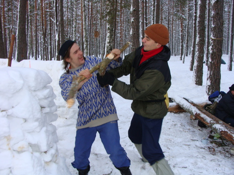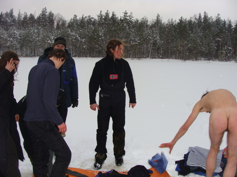 Удивились, что за ночь она так замерзла, что на ней можно было стоять. Черт, неужели усилия пропали даром? Берем полено и со всего размаху кидаем сверху вниз. Полено проламывает лед. Отлично! Заново разбиваем прорубь, чистим. Идем к костру греемся в запас. Почувствовав, что уже достаточно,идем на лед. Надя из самых лучших побуждений пытается нас отговорить от этой затеи, потому что прорубь, на первый взгляд, и в самом деле выглядит совсем не привлекательно – рыжая вода цвета болота. Да еще и мороз -10 и дует ветер.