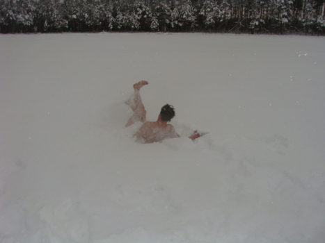 Приходит Джон, белорусский американец, лет 50, приносит здоровый дрын, и этим дрыном, как рычагом, мы выламываем льдину и заталкиваем ее под лед.Вычерпываем ледяную крошку – все,праздничный бассейн готов. Но купаться прямо сейчас почему-то не прет, значит,надо дождаться настроения.
