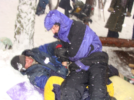 Участники залазят в спальные мешки с руками. Задача – перевалить через соседа, ничем себе не помогая. При этом «перевал» может идолжен сопротивляться. Затягивает.