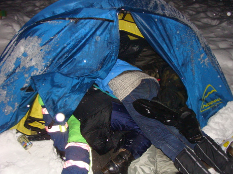 Около пяти утра народ начал ненавязчиво расходится.Меня, Любу, Альгерда и Лешу приютил Ваня в зимней палатке с печкой. Первый раз  в жизни я ночевал в палатке при комнатнойтемпературе, в то время как за бортом было примерно -10. Такие палатки на 8-10человек просто созданы для игры в«Перевал» или «Спелеологов».
