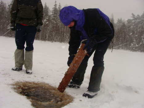 Игорь, опытный рыбак, советует перейти ближе к центру озера, потому что там двойного льда быть не должно. Переходим. И в самомделе, рубить значительно удобнее.Намечаем контур примерно полтора наполтора метра. Летят ледяные брызги,дело продвигается. Дорубаемся до воды,и вот начинается засада. Вода заполняет контур, по которому мы рубим, и аттракцион«Ледяные статуи» начинается снова.Пробуем ножовкой. Глухо. Ножовка тупобуксует по льду и ни грамма не пилит.Тогда немного меняем тактику. Рубим несильными ударами с размаху, а небольшими,частыми и точными, как будто бы открываем консервную банку. Работает. Прорезаем контур почти целиком.