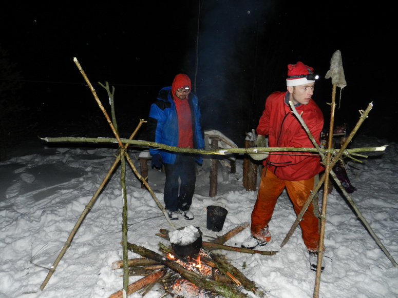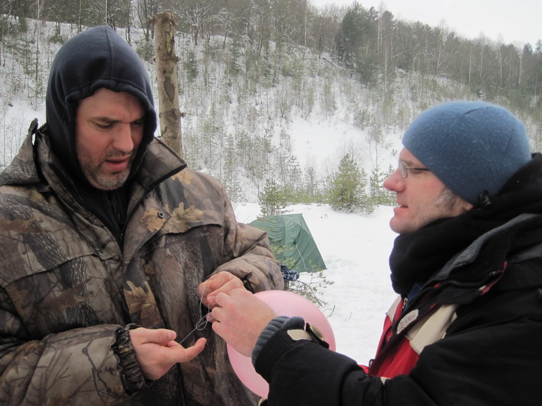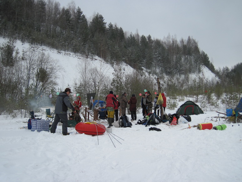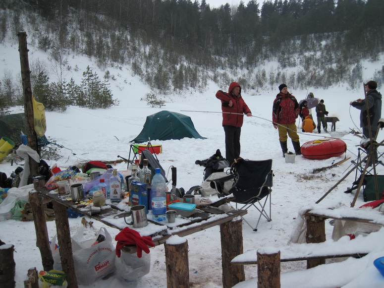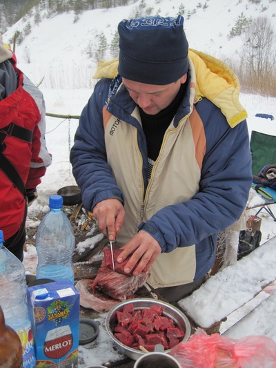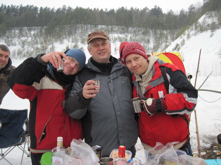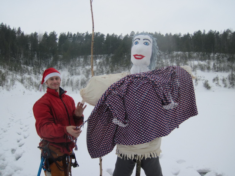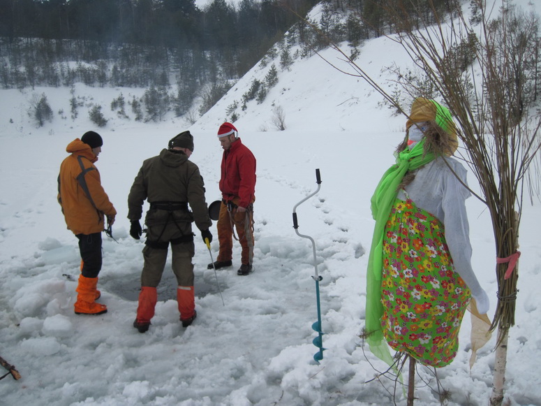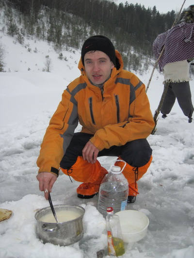 Масленница началась внезапно. Вот еще недавно все просто стояли у стола и балаганили, как вдруг подъехало еще народу, появились опоздавшие, количество людей достигло критической массы, и дело внезапно закипело. Леша и Саша Манцевич изготовили два чучела. Чучела закрепили на крестах, начинили газовыми баллонами и пиротехникой, и на закате эффектно взорвали на льду. Стол ломился от яств. Дело даже не дошло до шашлыков. Андрей Бай напек на всю бригаду блинов, а Саша Манцевич изготовил плов «Зубренок». Пару часов потратили на прорубание проруби. Какая же баня без проруби? И какая баня без Эдика? Эдик уже давно стал символом комфортной стоянки. Придешь в походе на ночлег, а там уже Эдик. И баня, и костер, и рыба, и уха, и уют.