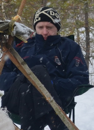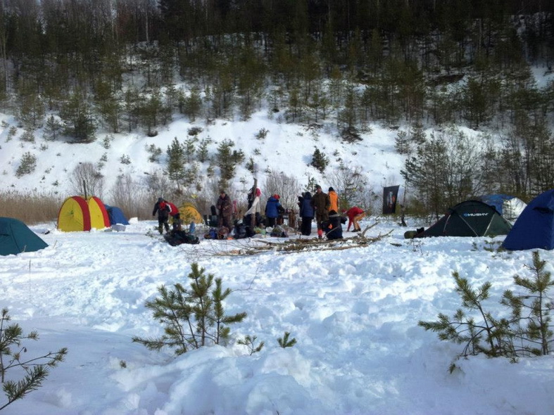 Последний километр до точки ехали просто через занесенное снегом поле, прокладывая дорогу для других участников, которые должны были приехать позже. Принцип «чем больше джип, тем дальше бежать за трактором» действовал безотказно. На последних метрах машина села, причем плотно. Не помог ни полный привод, ни пониженная передача, ни подкладывание веток и ковриков под колеса. Все измазались в мелу. Внутри машина выглядела так, как будто убили человека с белой кровью, и все разбрызгалось по салону. Бросили и пошли ставить лагерь.