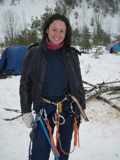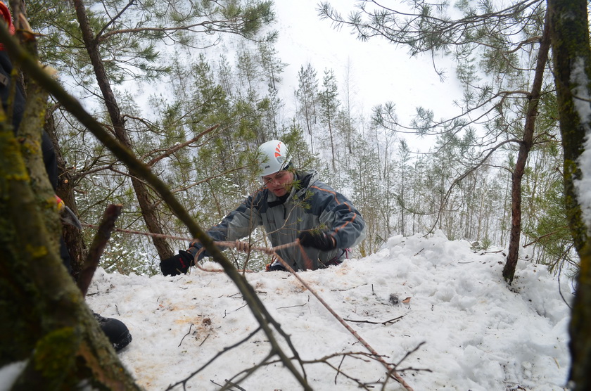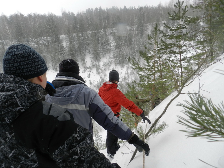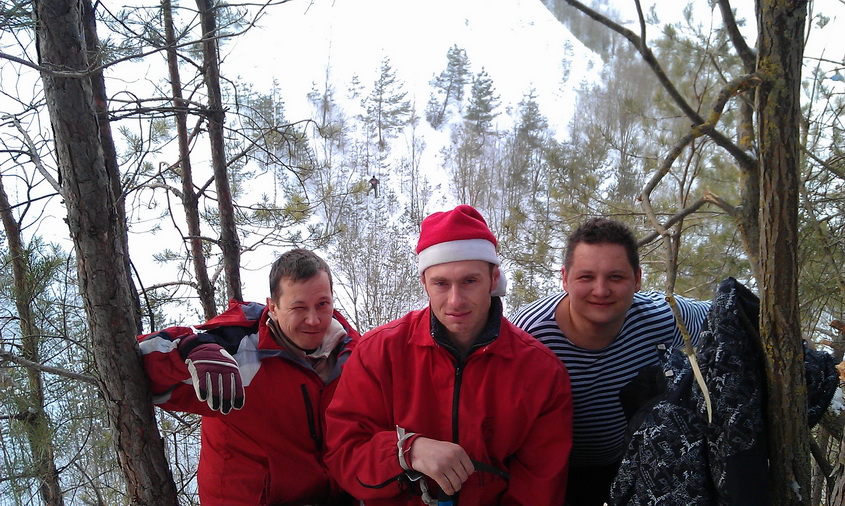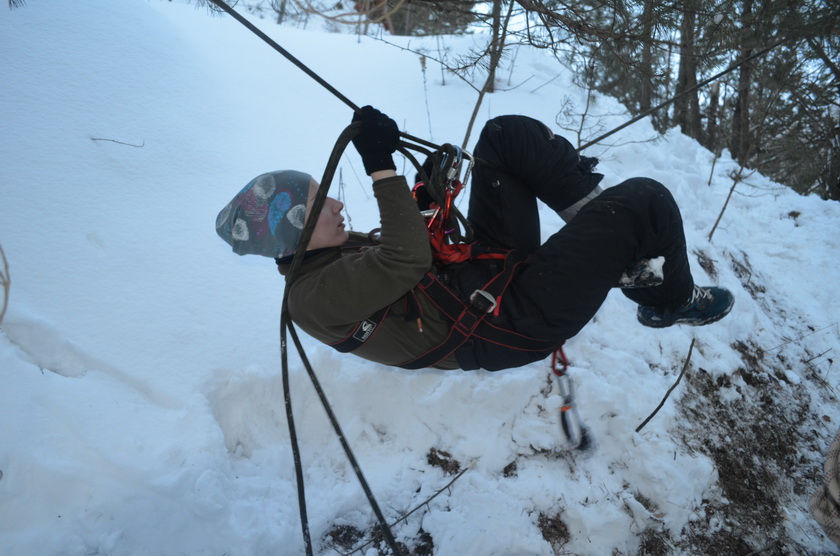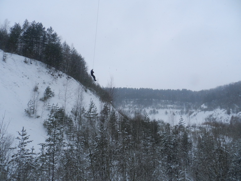 В действительности все самое интригующее происходило на высоте. Еще в пятницу между склонами была провешена веревка – для кого-то лишь забава, для меня – источник адреналина. Саша Смирнов терпеливо, доступно и авторитетно проводил инструктаж для новичков, рассказывал и показывал пошаговые действия: как верно надеть снаряжение, закрепить ролик, скользить по веревке и главное – как поменять страховки на высоте, чтобы затем спуститься по другой веревке вниз. Если сначала отпугивали лишь высота и смутное представление о том, как довериться этой тонкой веревке, то потом ошеломило умопомрачительное количество деталей, которое нужно держать в голове и четко выполнить на высоте, чтобы благополучно спуститься и при этом ничего не оставить на основной веревке после себя. Слушала внимательно, смотрела, как залихвацки всё выполняют Глаз в костюмчике Деда Мороза, Марат, не теряя своей обаятельной улыбки, Максим и др. Я чувствовала, как внутренне завожусь, и боязнь нового, необычного уступила перед спортивным интересом и желанием испытать свою концентрацию, физическую подготовку, способность положиться только на себя да на карабины с веревками…