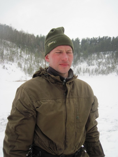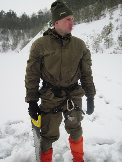 В воскресенье не очень и хотелось уезжать, особенно, когда так распогодилось. Был слабый мороз и светило солнце. По льду мы шли, еще когда в пятницу, он был мокрый. Теперь сформировалась плотная, сцементированная тропа. Поляну прибрали. Мы уходили последними, волоча под гору вещи, мусор, с одышкой и понуро переставляя ноги. Андрей Русьянов тянул внушительных размеров мешок, но стал пробуксовывать.