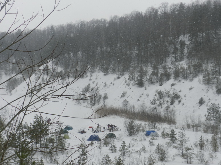 Человек пять не доехало, трое прибывших (я им сочувствую) уехало по причине возникших дома проблем, но обосновалось на месте что-то сильно под тридцать - примерно половина состава Секты. Добирались отдельными группами по 3-4 человека на личном автотранспорте. Поздновато в субботу, но еще было светло, наблюдатели увидели по склону спускающуюся четверку людей. Некоторые из них, было видно, проскальзывали часть пути юзом и восклицали.