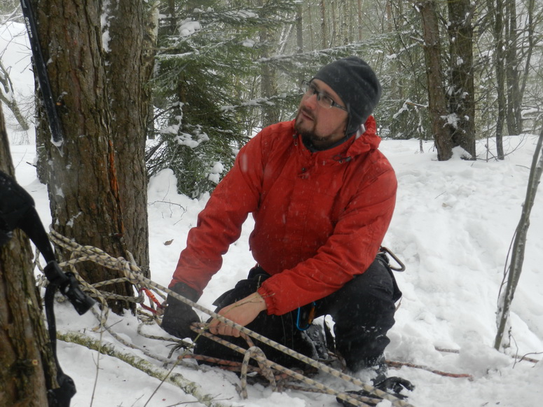 Передо мною отправилась Оля Смирнова, молодая мама, она успешно справилась не без поддержки Саши-геолога (он же Большой Саша) и осталась в прекрасном боевом расположении духа. Ее пример также придал решимости. Для меня самым страшным, к удивлению, оказалось - забраться на березу прикрепить ролик к веревке. Далее я долго и упорно до темноты следовала инструктажу, дело шло не гладко, трудна была чисто механическая работа над деталями. Когда же я была уверена, что мне остался последний этап – просто спуститься по другой веревке вниз и всё к этому готово, ко мне прямо при свете луны приехал на спасение Саша-геолог. Естественно, я самоуверенно отказалась от его помощи, он сперва послушался и спрыгнул, но потом решил проигнорировать мои слова и все же приехать ко мне уже с другого конца веревки – и счастье, что он сделал это. Узел, который я завязала под восьмеркой для дополнительной страховки, тормозил мой спуск (хотя именно благодаря этому безграмотно завязанному узлу я и не упала). Думали – не развяжем и придется резать веревку, но Саше удалось все красиво довести до конца. Настоящий мужчина, определенно знает, с какой стороны подойти к женщине, я бесконечно благодарна своему спасителю!!!