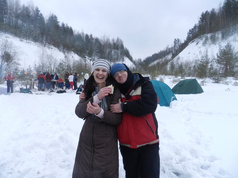 Забавный контраст, ведь к нашему приезду в Красносельск в самом разгаре были совсем иные СОБЫТИЯ, и оставалось только окунуться в них с азартом и интересом. Общая атмосфера в лагере близка к праздничной, была приурочена к Масленице: потому и очаровательнейшие чучела, цветные шарики повсюду и, конечно, блины. Все обязанности в секте Magadan.by распределяются очень ненавязчиво, местами происходит саморегуляция, но главное – общее дело никогда не стоит на месте. Блины готовил Андрей Бай (А.BY), помогала Таня (которая Глазовская), и Максим Полянский-Перепелица – сочно, горячо и просто вкусно, но над этой простотой ребята потрудились с отдачей. Им спасибо! Еще была уха и плов, только «уставом Секты» в целях дальнейшего безнаказанного ее существования запрещено разглашать, из какого мяса готовился плов... Запретила Оля Смирнова – она же жена Саши Смирнова, она же поставщик этого самого мяса, она же у костра задорно острила пикантными шутками, что бесконечно удивляло Марата (Нестеровича Марка Абрамовича), и она же 1-ой из девушек отправилась кататься на ролике по веревке.