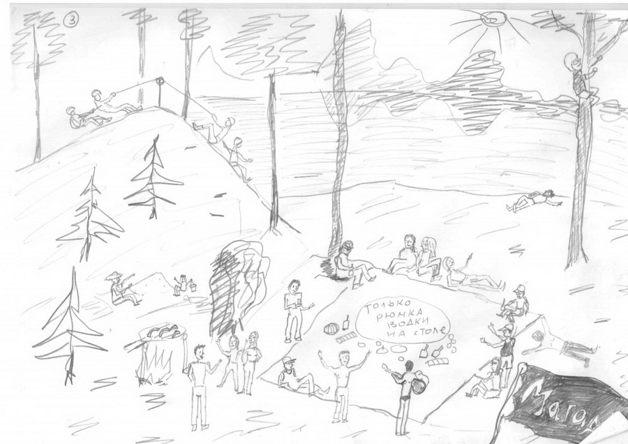 Приехав на лесную поляну , по флагу «Магадан» своих узнали сразу. Побратавшись с собравшимися мы приступили к активному отдыху. Виды отдыха каждый выбирал себе сам .Кто то смотрел или участвовал в подготовке к горному походу, спасении людей, работе со снаряжением. Кто то просто беседовал, или загорал на солнышке.Кто то разводил костер для барбекю. Отведывали чудо-зелье Миндибекова. Кто то уже отведал и отдыхал пластуном на речном берегу.