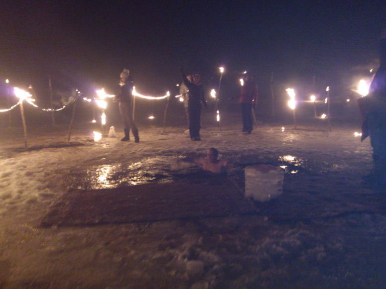 Мы занимались прорубью, Андрей Бай занимался отверстиями во льду для Факелов, Глаз занимался факелами, Палыч при поддержке толпы занимался лагерем.