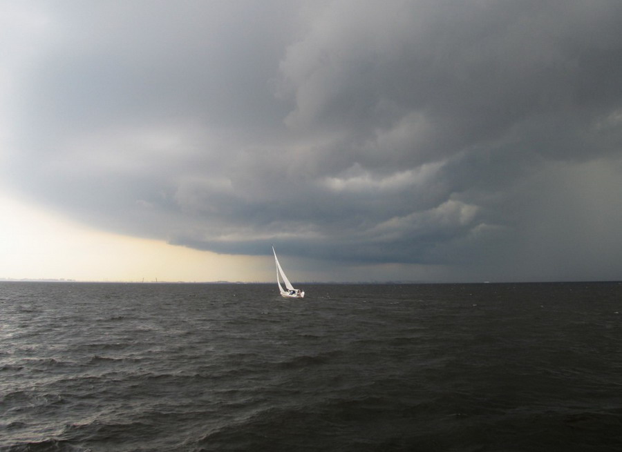 Наконец, около шести вечера мы вышли в Финский залив, взяв курс на Крестовый остров. К вечеру море разволновалось. Огромным валом с юга шел грозовой фронт, закручивая облака и провоцируя шторм.
