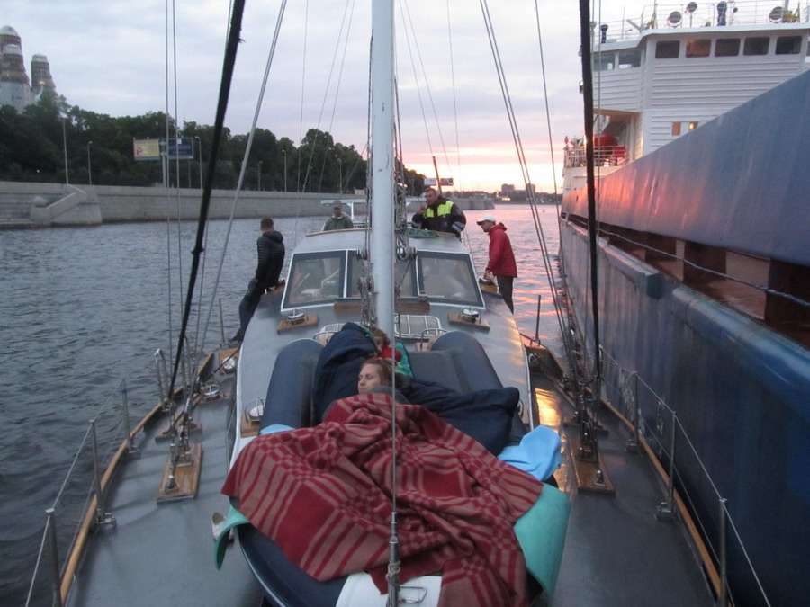 Возвратились ночевать на яхту в Кронштадт мы около 3-х часов утра. Яхта стояла на охраняемом причале, и еще с вечера было договорено с охранником, что ночью он пропустит на причал 9 человек. Но охранник спал, видимо очень крепко, и на настойчивый стук в ворота никто не вышел.