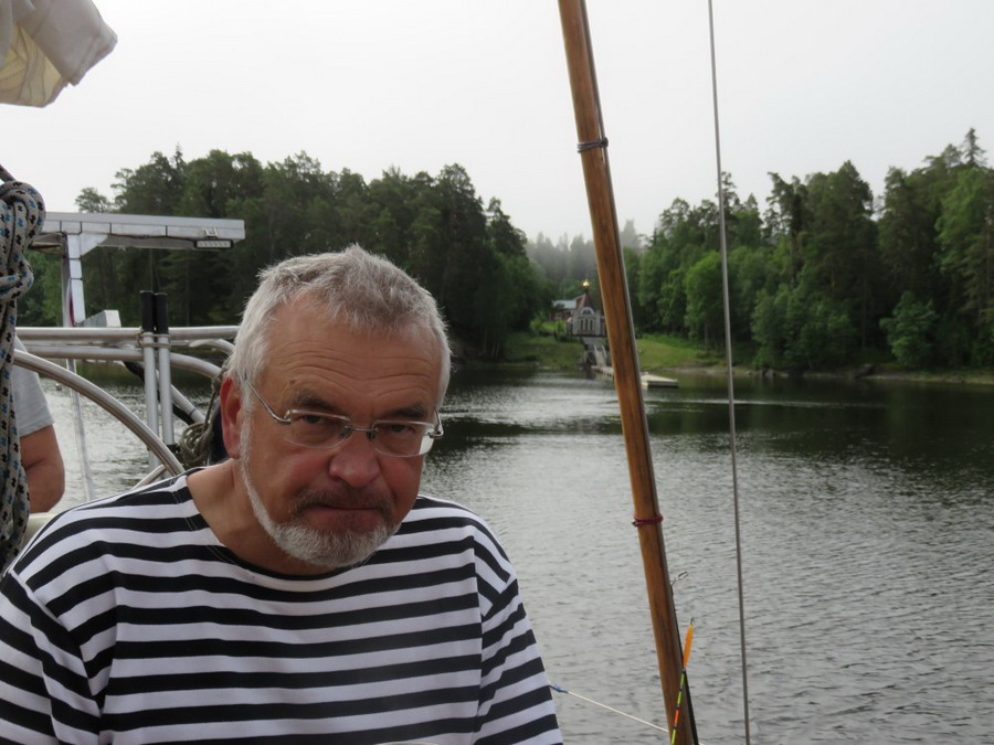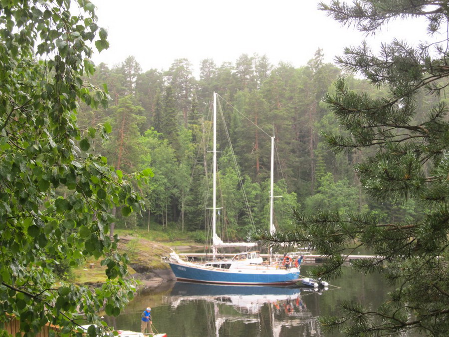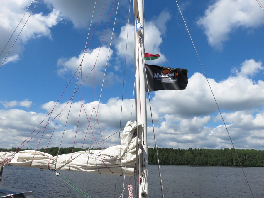 Как всегда, прогнозы на плохую погоду не оправдались. Выходили в Ладогу в малооблачную погоду, почти штиль. Несколько раз пытались поднять паруса, но ветер был слишком слаб. Поэтому шли под двигателем, заодно наша команда тренировалась в качестве рулевых держать курс. На зеркальной водной глади озера оставался хорошо читаемый зигзагообразный кильватерный след, который обозначал наши пока что неумелые попытки держать курс.