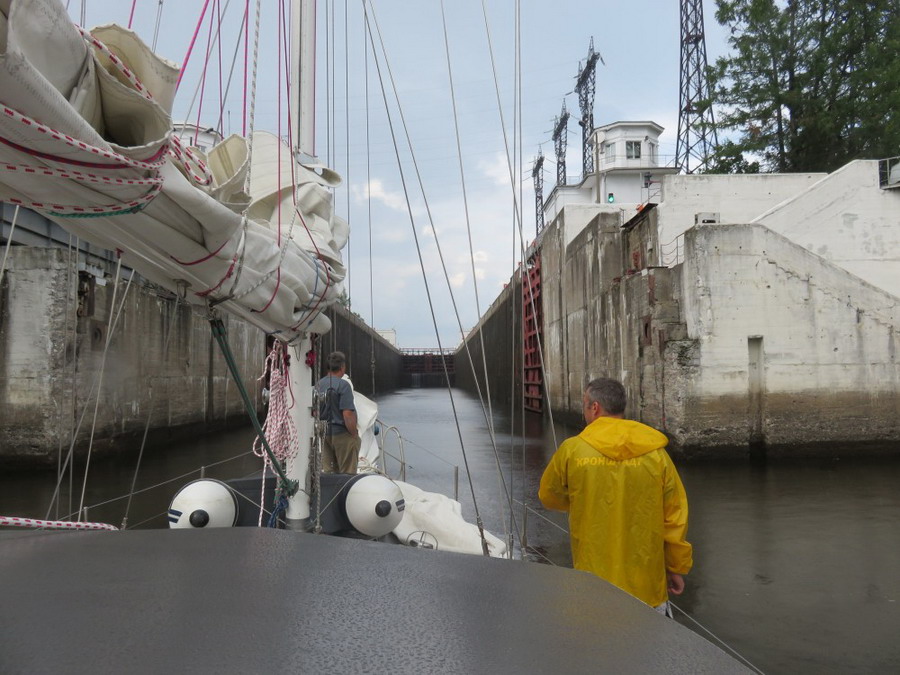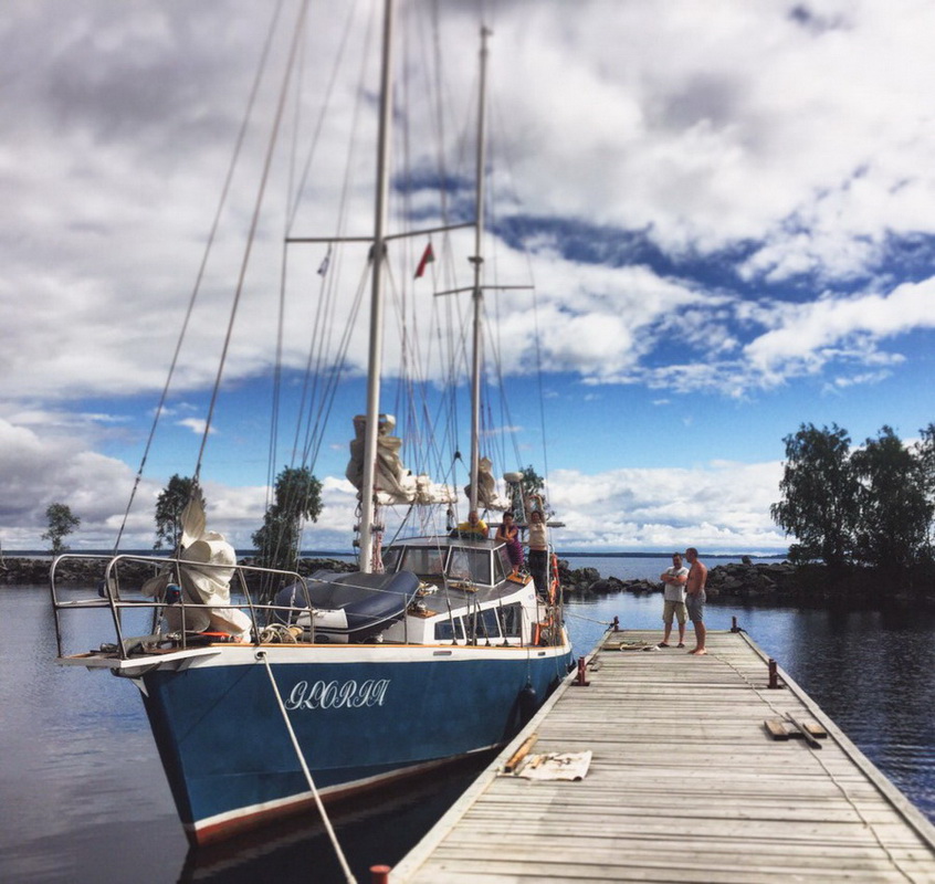 Одной из интереснейших частей похода было прохождение вверх по Неве через Питер. Загвоздка в том, что яхта с мачтами не проходит под мостами. Поэтому нужно было либо снимать мачту, а затем снова ставить ее в Шлиссельбурге специальным краном, либо нанимать лоцмана и платить за проводку через разведенные мосты. Капитаны смогли организовать нам второй вариант. Мы заранее подошли под Биржевой мост, который должны были развести специально для нашей яхты. На борт поднялся лоцман и на время стал главным на корабле.