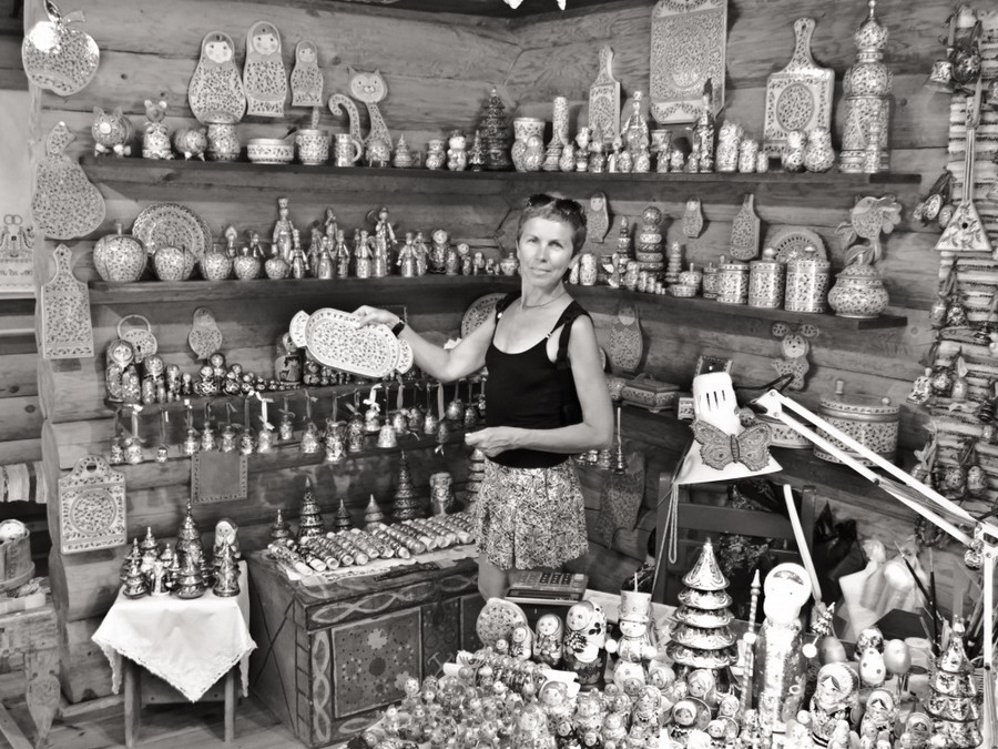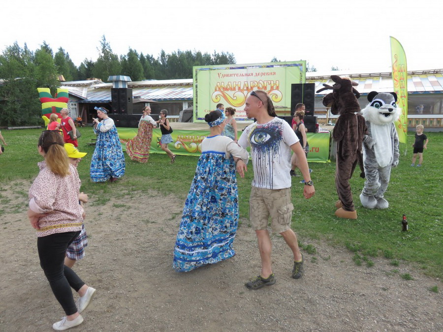 Вечером приплыли в деревню Мандроги. Это культурно-этнографический комплекс, похожий на наши Дудутки. В огромных деревянных домах, привезенных со всего Севера, были представлены различные ремесла - по дереву, по металлу, по тканям и т.д. Везде активно торговали сувенирами и поделками, а цены зашкаливали. И это очень напоминало турецкие и египетские фабрики, куда привозят праздных отдыхающих за коврами, дубленками, шубами, нефритовыми вазочками и продают втридорога. Вот так и здесь цены неадекватные: в Петрозаводске в киоске на вокзале такие же изделия стоили гораздо дешевле.
