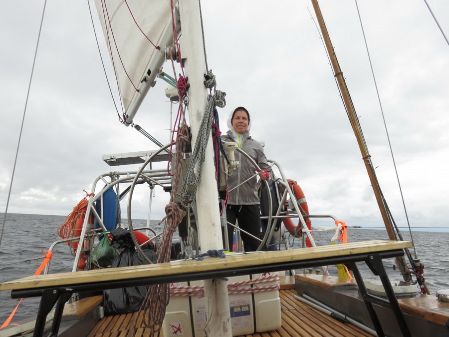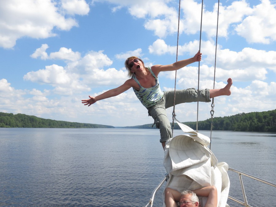 Все два дня, которые мы шли по Онежскому озеру, дул бодрый ветерок. Поэтому сразу же поставили паруса. Шли с хорошей качкой и креном. И вот тут наконец-то Оля Конькова, которая весь поход стенала, что шторма очень не хватает, получила свой заряд эмоций. А унитаз - заряд из Оли. Меня тоже мутило. Особенно в каюте. Лучший способ справится с качкой - лечь поспать или встать на руль. Я выбрал второе.