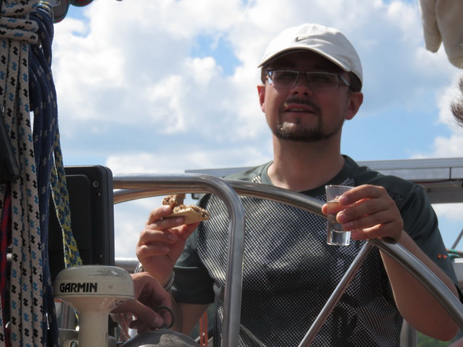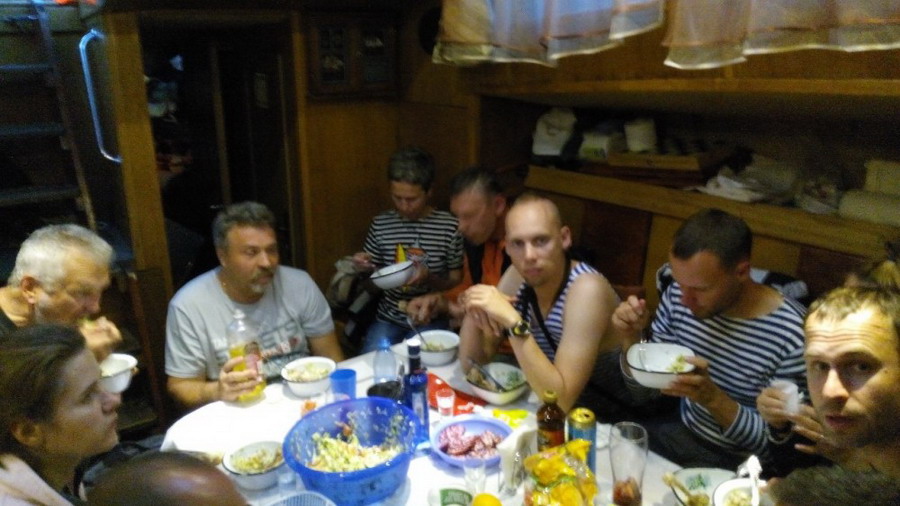 А вот пиво оказалось весьма кстати в этот жаркий день! Перманентное застолье, начатое сначала в кубрике, выплеснулось на палубу. Пошли в дело крепкие напитки и легкие закуски, и пожалуй впервые с начала путешествия, у нас действительно состоялась настоящая пьянка. До этого мы алкоголь употребляли больше “для сна”, чем “для веселья”.