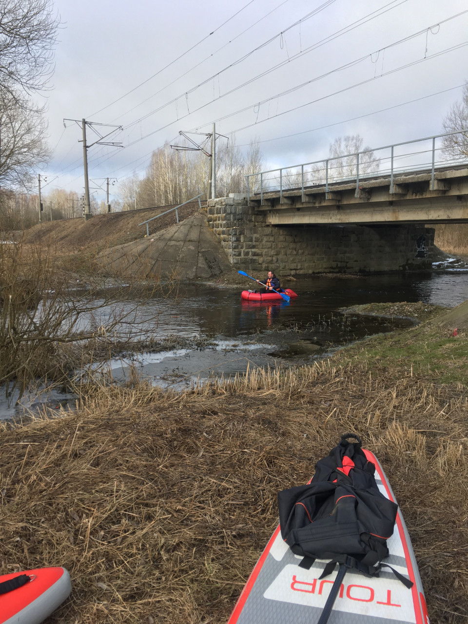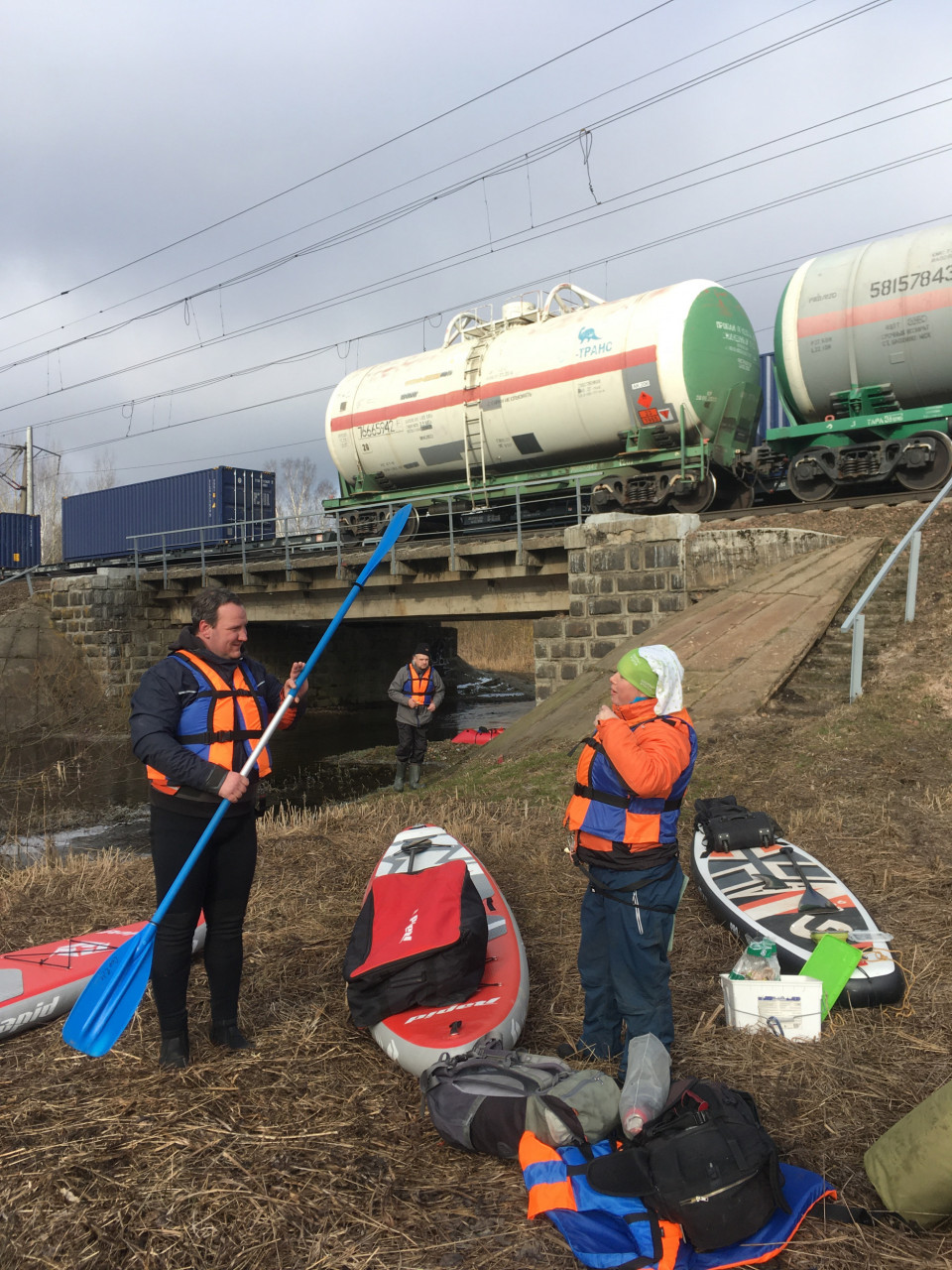 Шустро высадились на темный асфальтированный перрон. В комплекте с сапдоской выдается весло, насос и сумка на колесиках. Подобная тем клетчатым сумкам, что таскают за собой пенсионеры. Вот и сейчас бабули с такими же почти сумками как наши, из которых торчали саженцы, потопали к деревням. До стапеля по перрону идти минуты три. Мы подхватили вещи и двинулись вдоль ЖД путей обратно к реке. Под мост вела разбитая каменная лесенка.