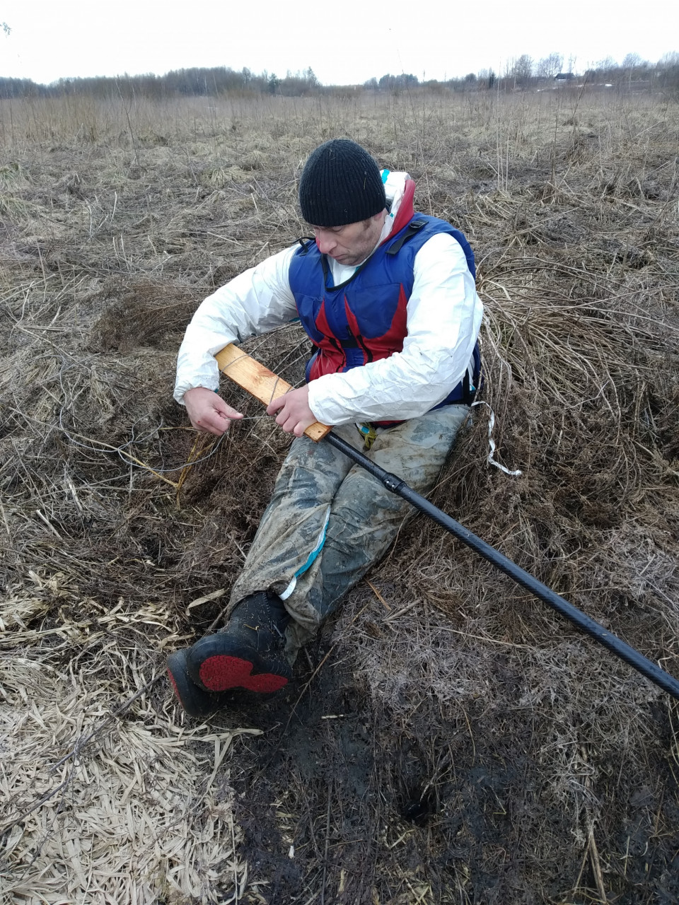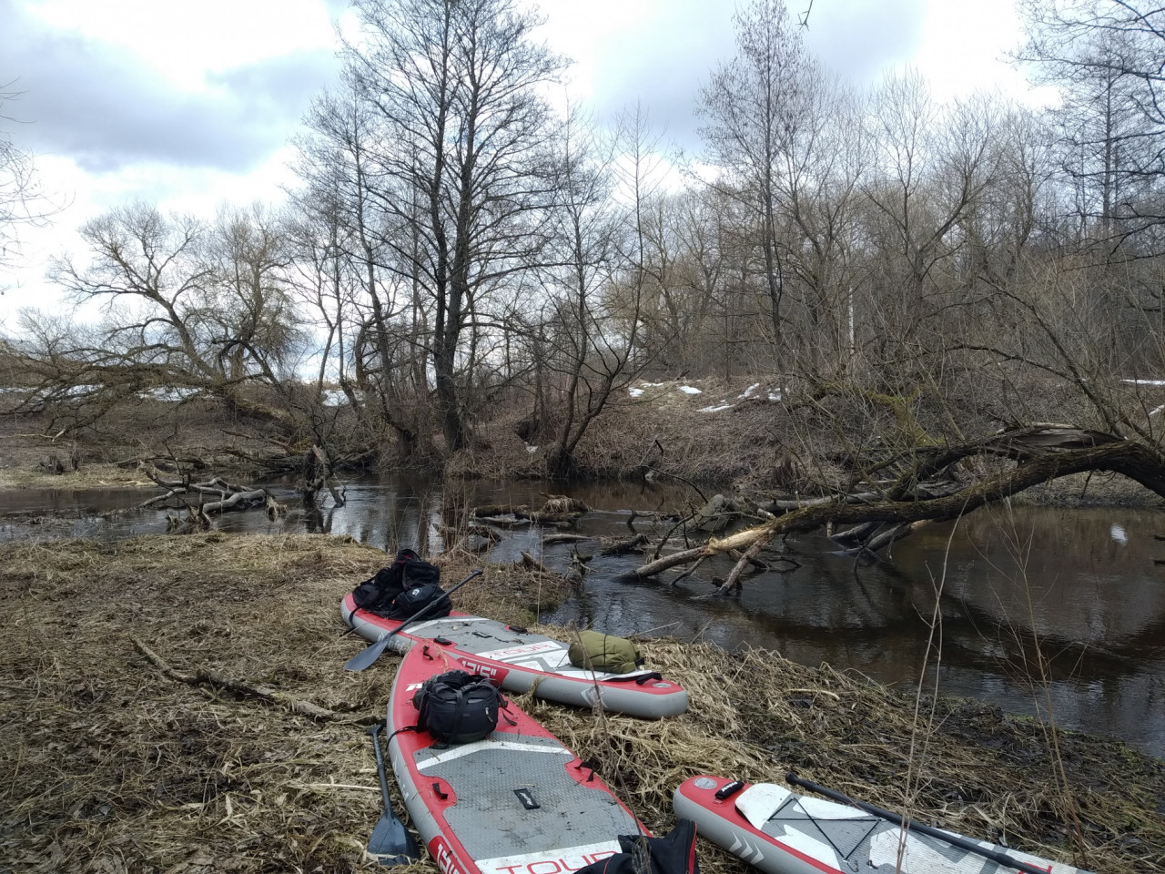 Тут же мы решили причалить к берегу и поразмыслить, как быть дальше. Вытащили на сиротливый полуостров, поросший жухлой травой и темными кустами, наши доски.