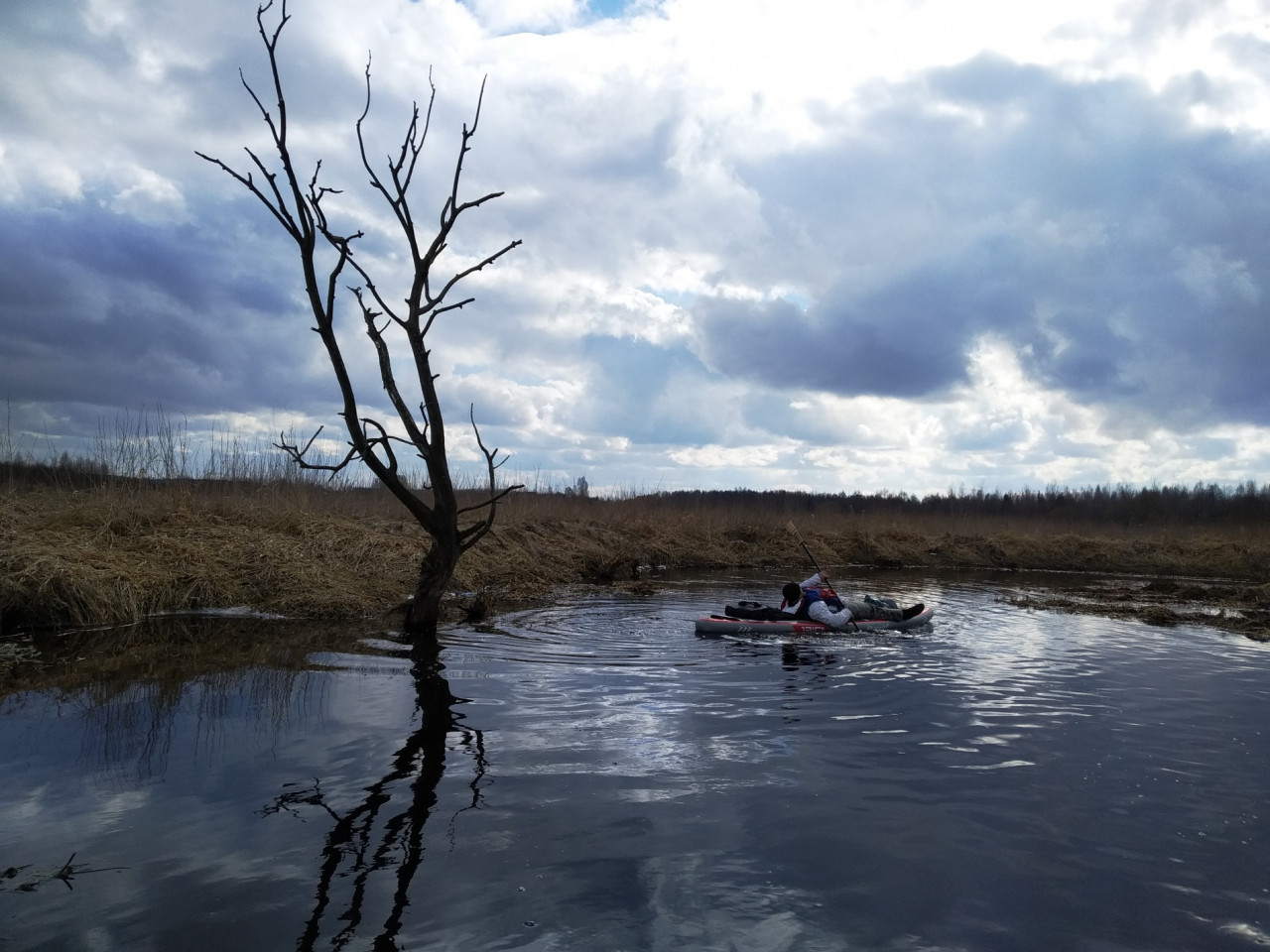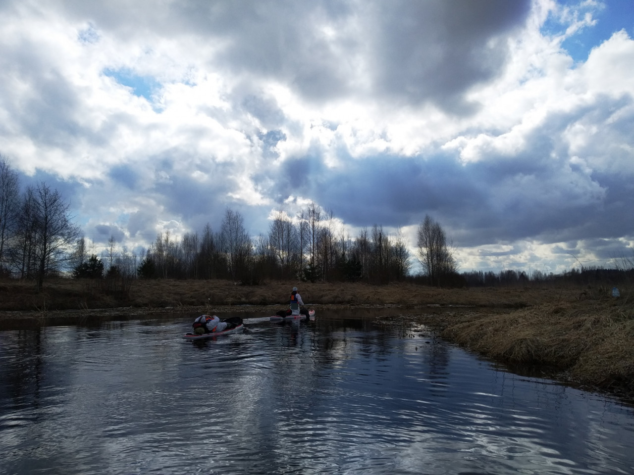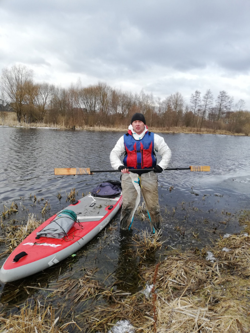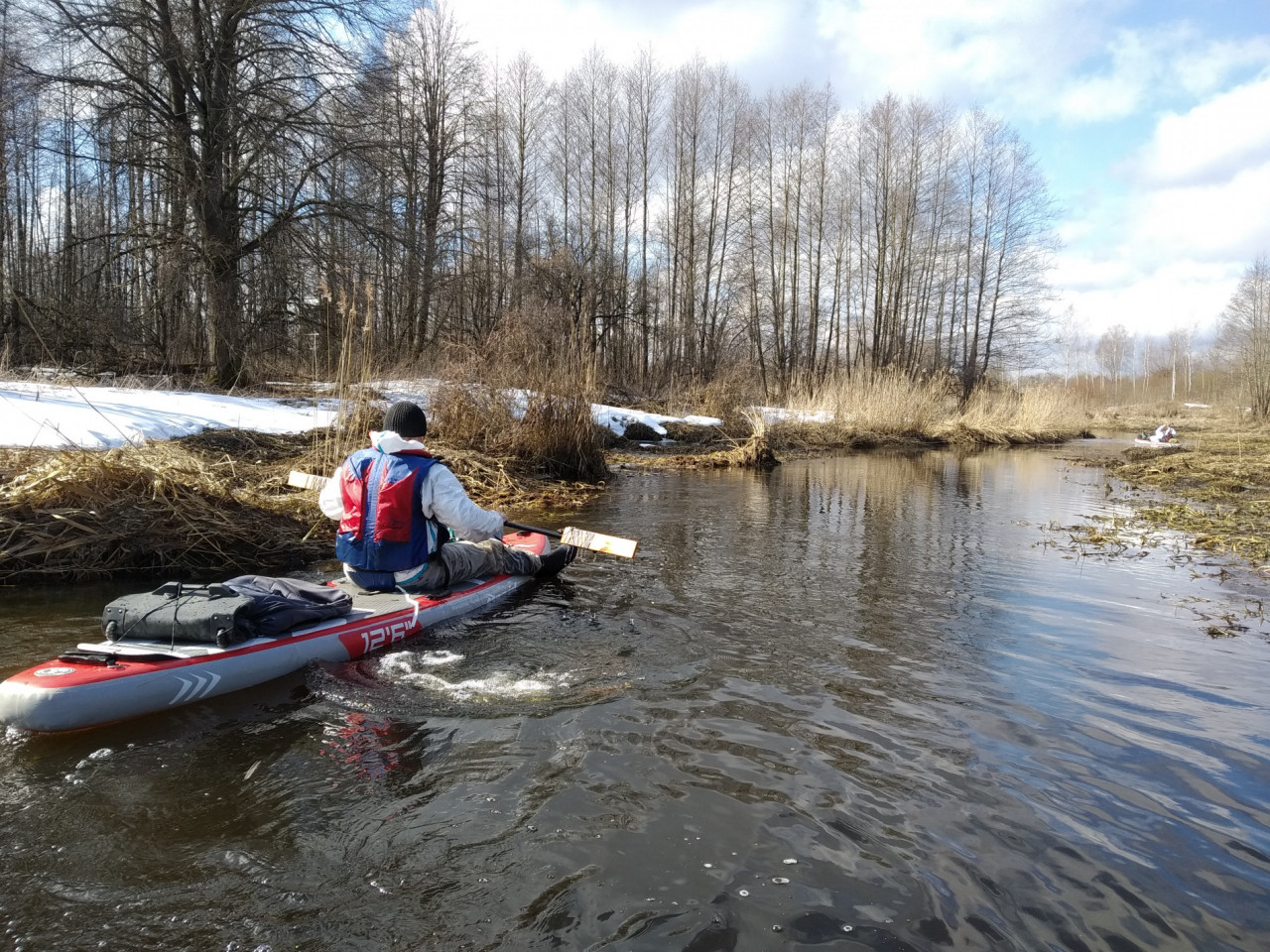 Помимо пяти сапбордов была в составе нашего флота красная надувная байдарка Хатанга 3 Спорт. Габаритный Олег Соловьев в этой маленькой лодке выглядел весьма мультяшно. Он первым встал на воду и был таков. Более мы его в течение дня не видали.