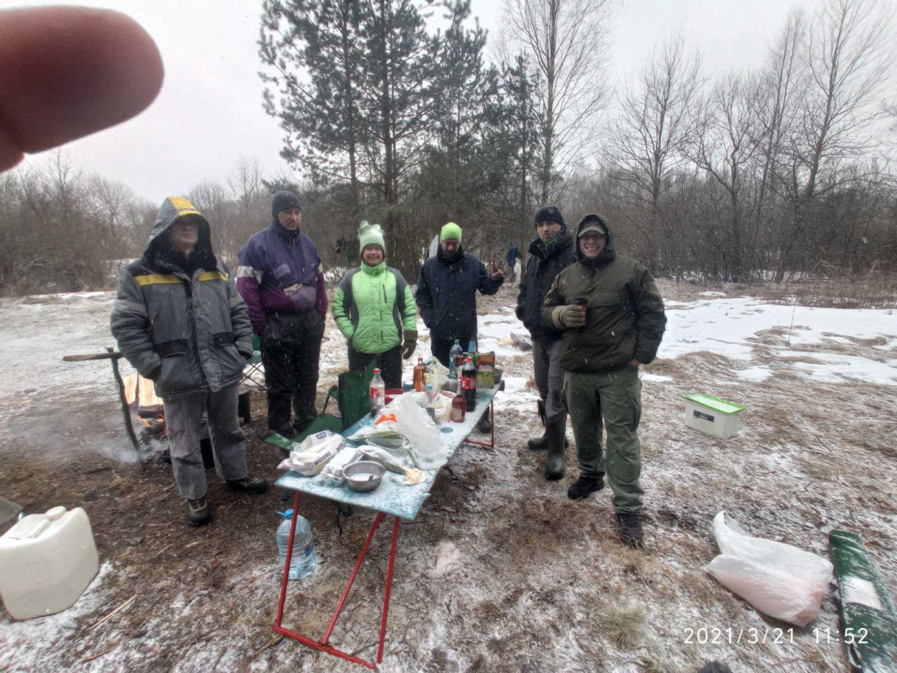 Встречала нас Группа Моральной поддержки и Технического обеспечения. Их значимость и вклад в этот поход сложно переоценить! Мы, мокрые, совершенно продрогшие, были встречены горячо и тут же окружены заботой. Подходящего места для стоянки вблизи не оказалось. Здесь все насквозь продувалось поднявшимся ветром. Лагерь разбили на берегу Березины километрах в пяти. Туда нас перевезли на машинах Гетюки и Эдуард Лимонов. В лагере уже Алексей Сантехник и Юрий Костузик вовсю рубили дрова. Леха Кадуцкий варил уху из стерляди. Рыбу стерлядь я видела впервые «вживую», хоть не особенной живой она уже и была. Весьма примечательны мордочки этих рыб- почти лица. Со вздернутыми носами. Кажется, что даже рот у рыбы растянут в улыбке.