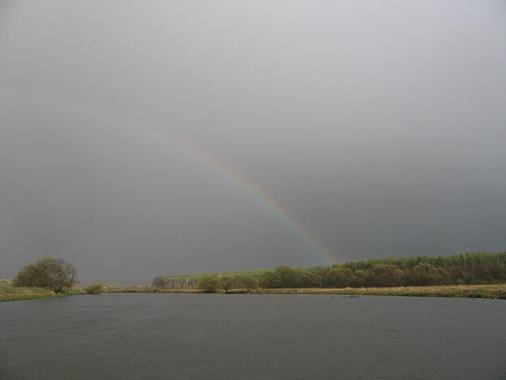 Собака, вроде и хотела угодить, виляла культей купированного хвоста, но в холодную воду лезть не очень хотела. Но все таки… поплыла. Большое весло оказалось ей не совсем по зубам и на пол дороги она его бросила. Снова уговаривали. На этот раз собака доплыла с веслом до самого берега. Глаз с Дедом были очень довольны. Мокрую Иринку усадили на палубу вместе с собакой и накрыли тентом. Неожиданно всем стало скучно. На левом берегу тянулась деревня Дукора. Шелестел ветер, собрав впереди нас свинцовую тучу. Сзади светило солнце и над Свислочью висела радуга. Было очевидно, что сегодня далеко мы не поедем. Впереди виднелся лес. Молодой, сосновый.