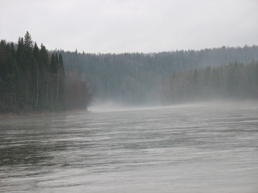 Периодически шел скупой дождь. Видимость очень слабая из-за тумана. Вода все прибывала. Два метра оставалось от нашей печки до ее кромки.