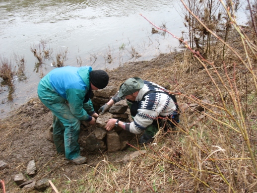 Какие-то булыжники просто выколупливали, некоторые приходилось ставить на ребро с помощью лопаты. Некоторые были очень тяжелые. Оба вымазывались в грязь, но больше Евгений Викторович. Люблю заниматься делами, которые увлекают. Венец за венцом поднимался наш очаг.