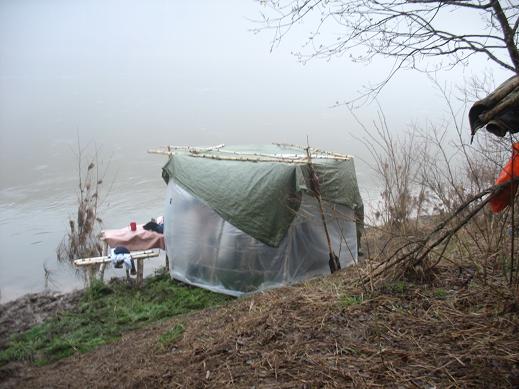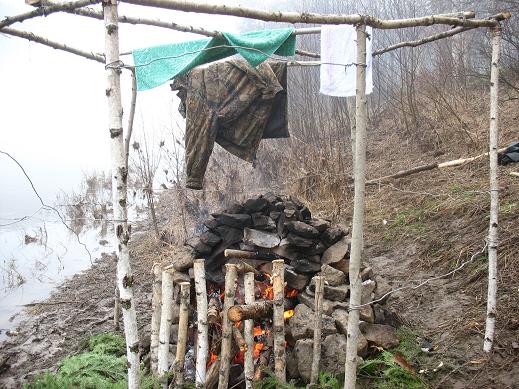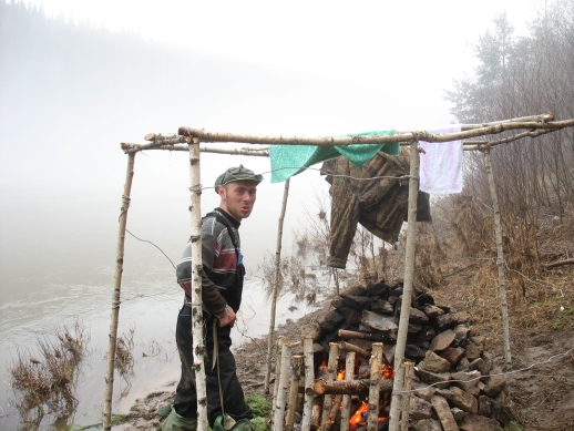 Первым вылез Евгений Викторович и пробовал растопить очаг. Все мокрое. Очаг разожгли совместными усилиями. Разгорался долго, не шатко не валко. Но мы заставили. Над камнями завихрились струйки нежного, ломкого дыма, который смешивался с густым холодным, который достиг апогея. Едва прослеживались контуры противоположного берега.