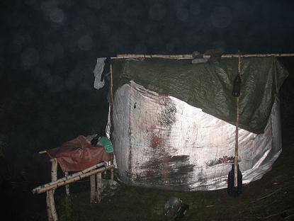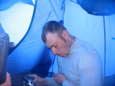 Палатки ставили очень быстро. Соседи хотели сначала туда, где затем затопило, но сообразили выше. Диджей Ясь, весь мокрый от дождя лежал на бруствере горки. Вопрос о костре не стоял. Собрались ужинать в Сашенькиной палатке. Дождь по тенту выбивал барабанную дробь. От дождя шел пар. Сашенька крутил ручку генератора. Звонила и Лена – первый раз за поход, но только не по карточке BILAIN GSM, а по Сашенькиной.