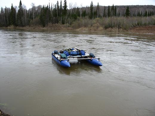 В Кыне многие группы заканчивают путешествие, о чем свидетельствует обилие катамаранных рам, выброшенных на берегу. Во дают! Скотчем вяжут жерди.