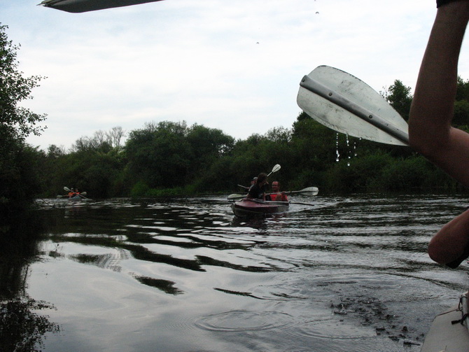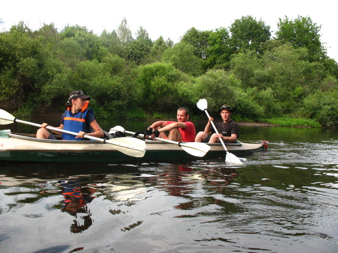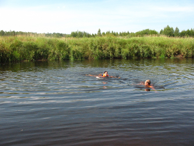 Со слов Глаза, речка была широковата для байдарок и не отличалась течением, поэтому средняя скорость составляла поначалу 5 км в час. Шли достаточно дружно и воодушевленно, каждый экипаж беседовал о чем- то своем и удовлетворенно загребал веслами. С первых минут и до окончания сплава впереди шла чета Смирновых, которые нашли свой темп и работали достаточно слаженно.